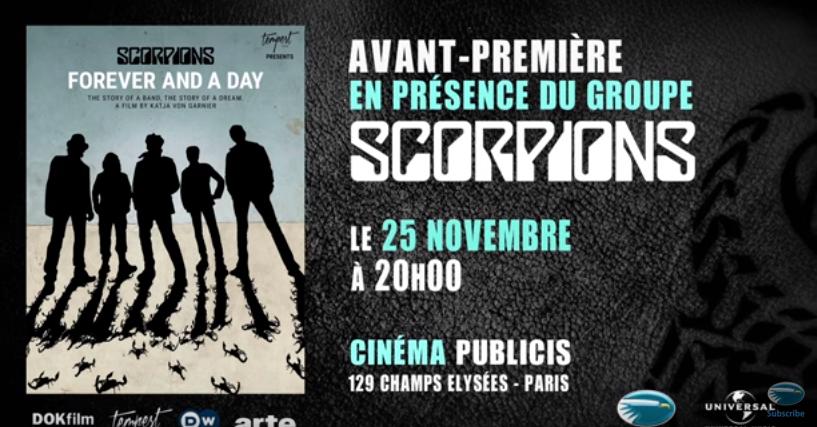 Toujours en parlant de Scorpions, le groupe sera présent lors de la projection de leurs film, le 25 novembre (soit le lendemain de leur concert à Bercy…si maintenu), au cinéma Publicis des Champs Elysées. Pour le moment, pas de date de prévente des billets, mais surveillez les billetteries Fnac.