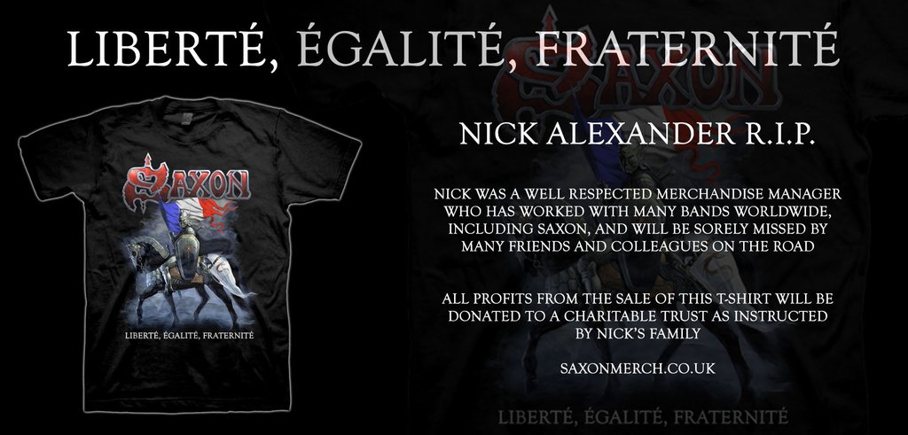 Saxon, visiblement très touché par les événements du Bataclan, vient de sortir un T-Shirt où l’intégralité des fonds ira à une oeuvre de charité, du choix de la famille d’Alexander. Nick Alexander était leur ancien responsable merchandising. Le T shirt peut être commandé ICI au prix de 20£ (tailles femmes dispo).