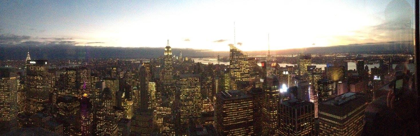 Me voilà donc au Top Of The Rock. Ce nom barbare désigne simplement le nom de la terrasse panoramique au sommet de la GE Building (une composante du Rockefeller Center). Comptez 20$ (idem, réservez vos billets à l’avance sur internet avant de venir, ça vous évite de faire la queue) pour monter à l’aide d’un ascenseur qui a un plafond transparent, sur lequel sera retransmis l’histoire du building (et vous verrez surtout les étages du dessus arriver à toute vitesse). En effet, le GE Building abrite les bureaux de la NBC et de tout un tas de Talk show connus outre Atlantique, à savoir les Jimmy Fallon ou les Saturday Night Live. Je vous conseille la visite à la limite du coucher du soleil, le spectacle est de toute beauté, avec l’Empire pile devant vous. On y voit très bien la Cathédrale St Patrick en se penchant un peu et tout un tas de détails qu’on ne peut pas distinguer du haut de l’Empire.