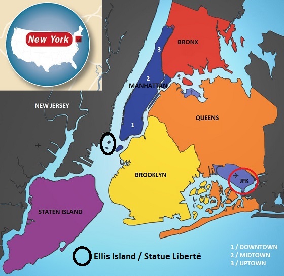 La statue a été offerte par la France (et construite en France avant d’être assemblée sur place) pour symboliser les 100 ans de l’indépendance des USA, en 1886. Elle mesure 93 m de haut de sa base jusqu’en haut de la torche (la statue seule mesure 50 m). Elle était le premier repère des migrants lorsqu’ils arrivaient par l’Océan, d’où son nom de « liberté éclairant le monde ». La Statue fait face à l’océan Atlantique et à la France, là où demeure sa réplique officielle.