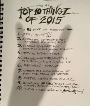 Pour les fans de Metallica, James a fait sa liste des 10 choses préférées de son année. En n°1 on retrouve le fait qu’il soit en vie, en n°10, le fait que Justin Bieber porte un T shirt Metallica. Entre tout ça, on a le fait qu’il voit ses enfants grandir, qu’il ait rencontré Robert Plant, qu’il ait pu jammer avec Jerry Cantrell, pu tirer au fusil sniper d’un hélico ou encore la sortie de l’album Purple de Baroness.