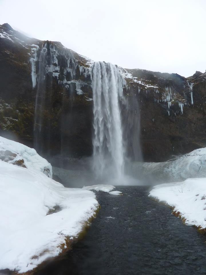 Au retour, on passera par 2 cascades impressionnantes (mais ce n’était rien, comparé à celle qui m’attendait le lendemain) : Seljalandsfoss et Skogafoss, situé à Skogar (6). La première mesure 65 m de haut et en été, on peut se glisser derrière, dans la caverne, pour l’observer couler de l’autre côté. En décembre, le tout étant gelé de partout, impossible de s’y faufiler. La seconde est aussi haute mais plus large (25 m). Idem, en été, vous pouvez escalader la cascade sur son flanc Est, et découvrir des merveilles comme le massif du Landmannalaugar.