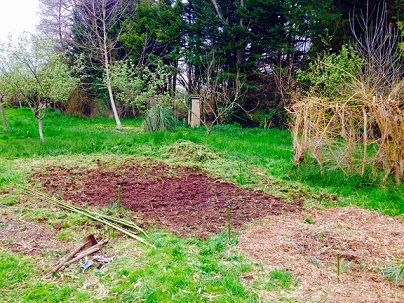 Prochaines étapes : placer les tiges de bambous coupées entre chaque petit piquet de bambous pour faire un super entourage naturel, terminer le 1/4 à biner et planter les semis et plants…Vous voyez, ça prend forme ><