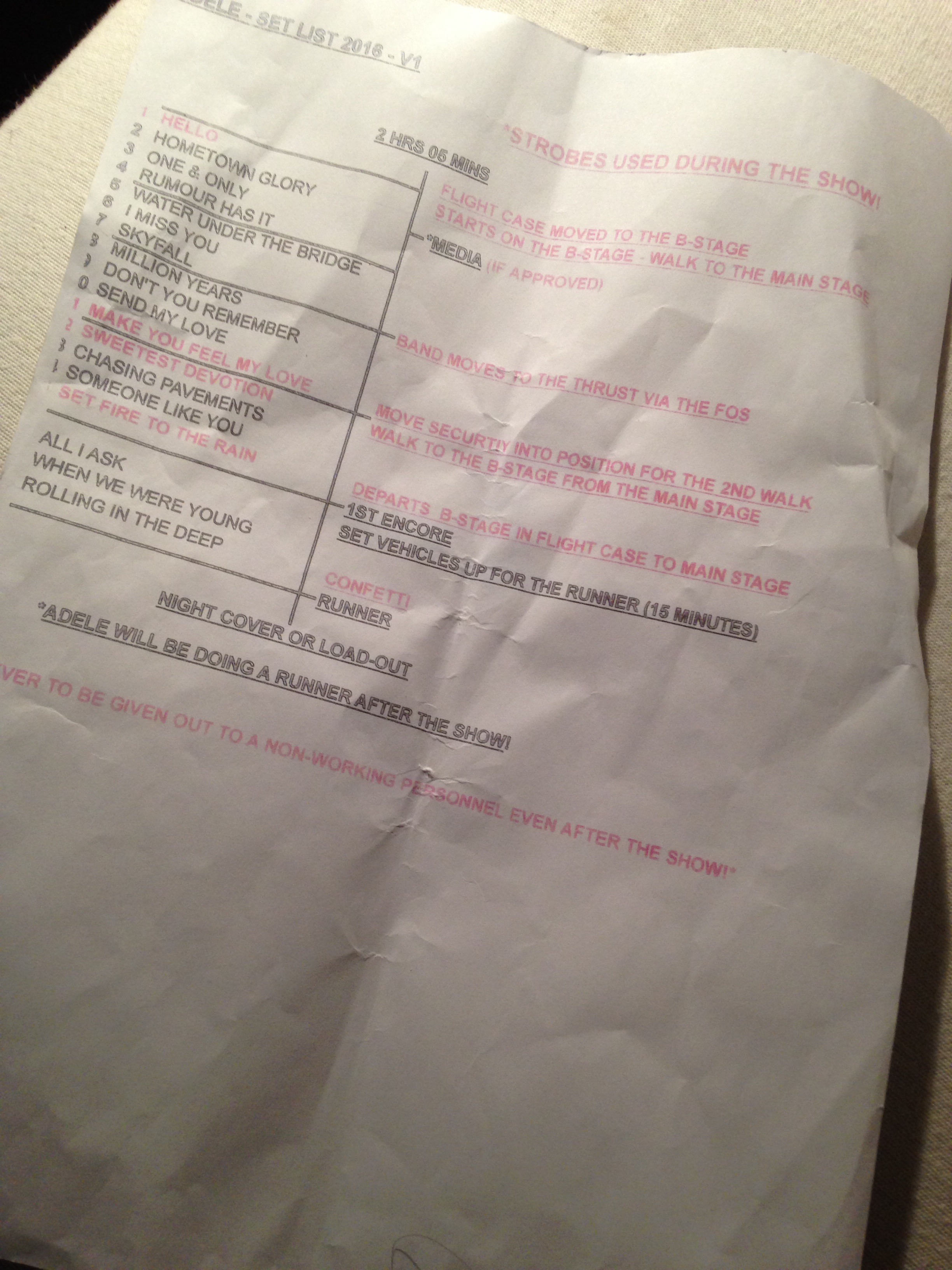 La setlist ne recèle que de pépites, alternant les albums 19, 21 et 25. Le son est exceptionnel, le claquement de percussions sur Rumor Has It est tout simplement incroyable, il en sera de même sur le titre de clôture Rolling In The Deep
