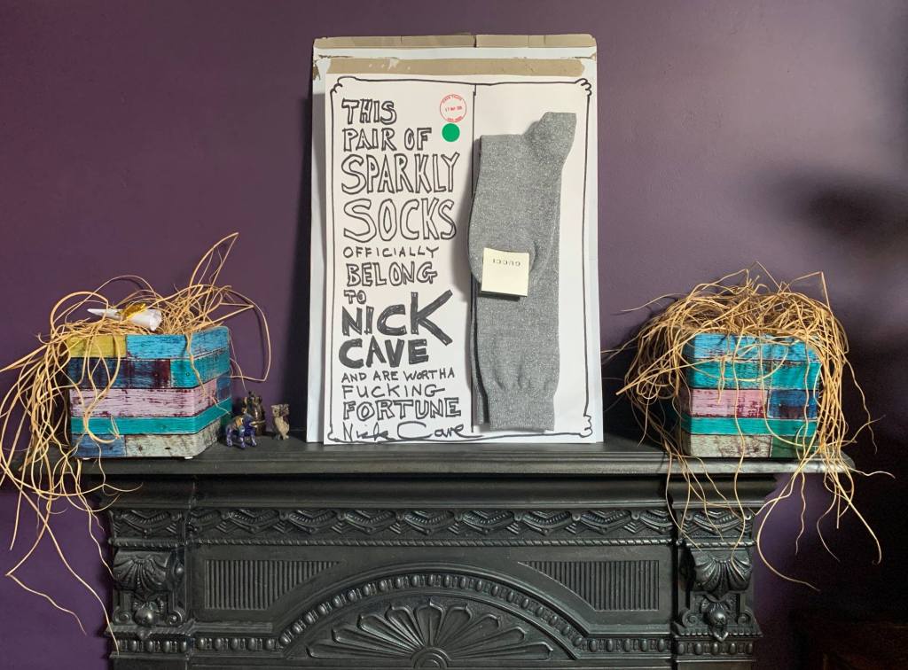 Chris Perdue est super fan de Nick Cave et est le propriétaire d’une petite salle de concert Londonienne « Trinity » (200 places). Hélas, il ne peut rentrer dans aucune case d’aide gouvernementale c’est pourquoi les habitués du lieu ont lancé une cagnotte en ligne. Cette salle a permi de sacrés coup de pouce à Kate Nash ou Chase & Status. La communauté s’est donc mise en ordre de marche pour alerter Nick Cave et lui demander à son tour un coup de pouce. Interpellé sur les réseaux sociaux, l’artiste a décidé de mettre aux enchère sa paire de chaussette pailletée Gucci qui selon lui « vaut une putain de fortune ». La vente aux enchère a commencé le 4 juin et durera une semaine sur la page Facebook dédiée