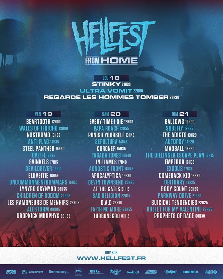 Depuis hier soir 20h, les hostilités ont débuté sur Arte Concert et Hellfest.fr. Ne loupez pas 15 concerts/jour pour un Hellfest From Home. Le reportage « Hellfest, 15 ans de bruit » diffusé hier soir en exclue sur Hellfest.fr sera retransmis le 26 juin à 23h55 sur la chaîne Arte. Idem, demain, à 1h05 sur la chaîne Arte sera retransmis le best-of de l’année 2019 (reportage déjà disponible sur Arte concert).