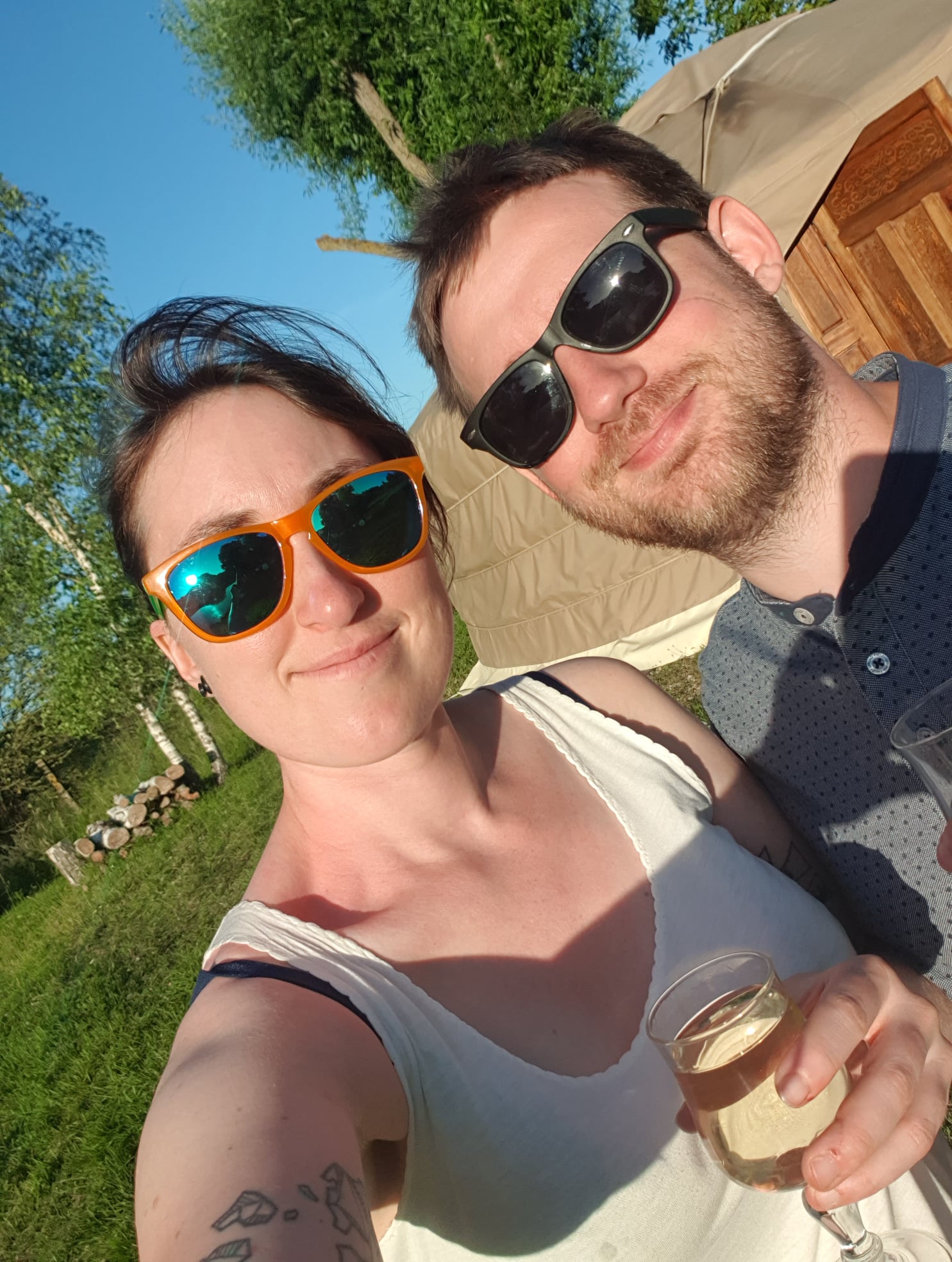 Repos mérité sur la petite table de pique nique de la yourte et installations dans nos appartements. Sous 32°, la yourte n’est pas le logement le plus frais mais s’aère facilement donc pas intenable.