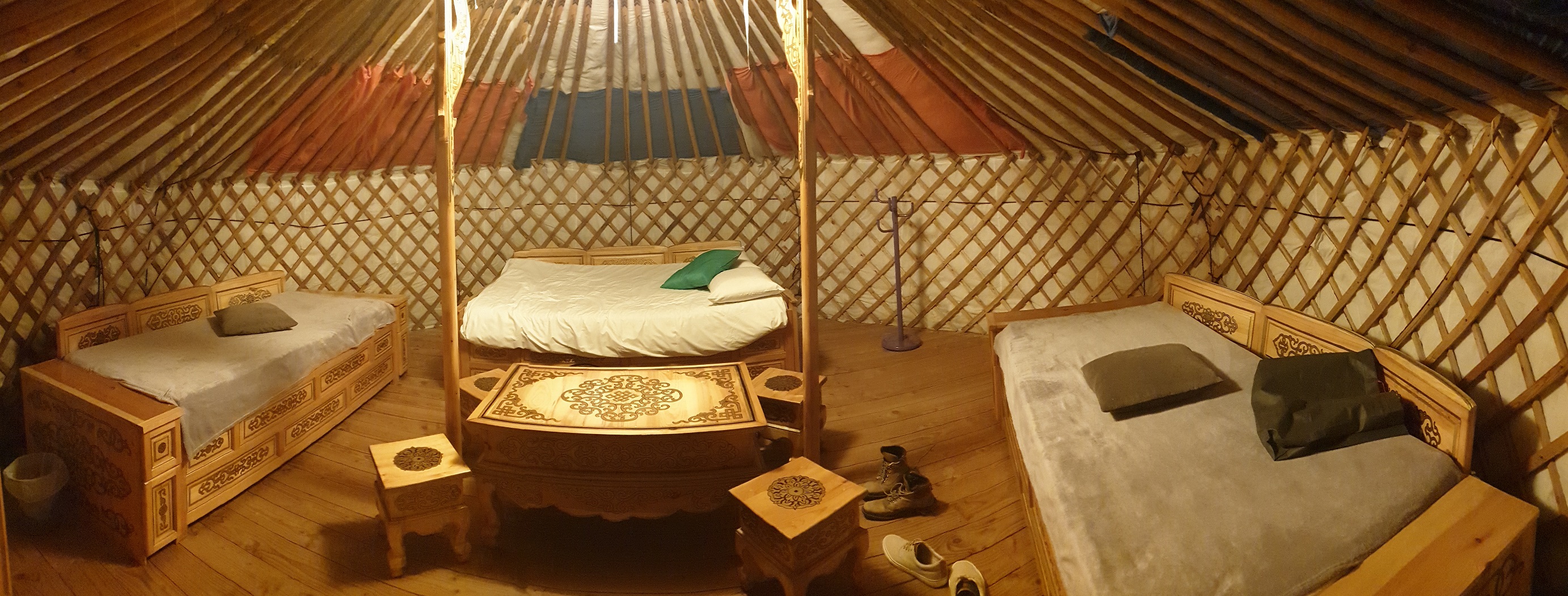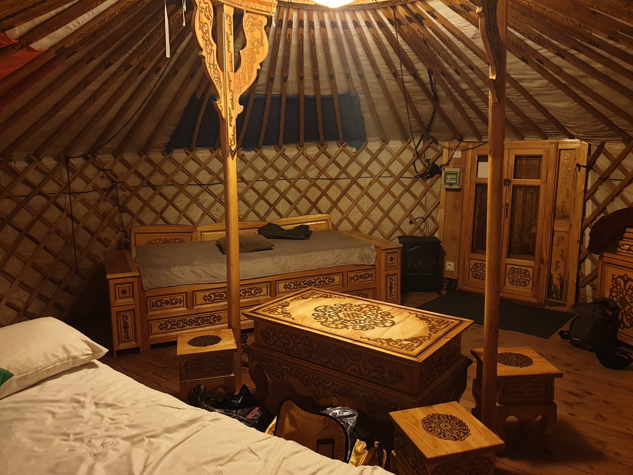 Dodo dans la yourte avant un réveil à 8h30. L’espace est immense, elle est prévue pour 4 personnes soit 27m² avec 2 lits simple et un lit double. Les matelas sont top confortables, difficile de se lever dans de telles conditions, on y resterait des nuits et des nuits (et au frais pendant la nuit, impeccable).