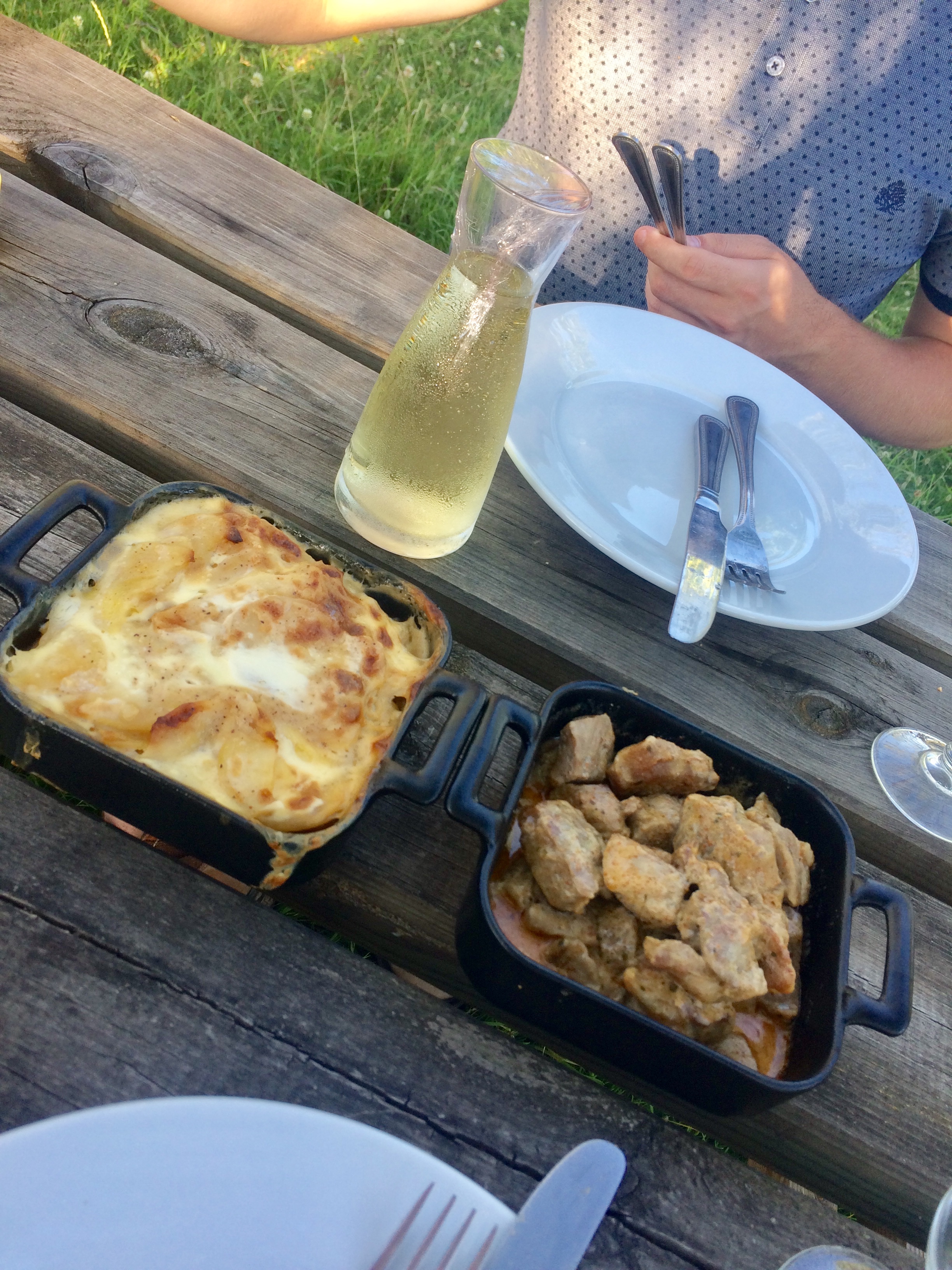 Au menu pour nous ce soir là c’était tarte au Ste Maure de Touraine et oignons / gratin dauphinois et porc mariné au curcuma / fromage / crème brulée. Le chef cuisine sur place des produits frais et locaux qu’il sert dans une caisse réfrigérée en voiturette électrique à tous les hébergements. Si vous êtes au début du domaine, vous serez livrés vers 20h, si vous êtes le dernier logement, comptez plutôt 21h 😉