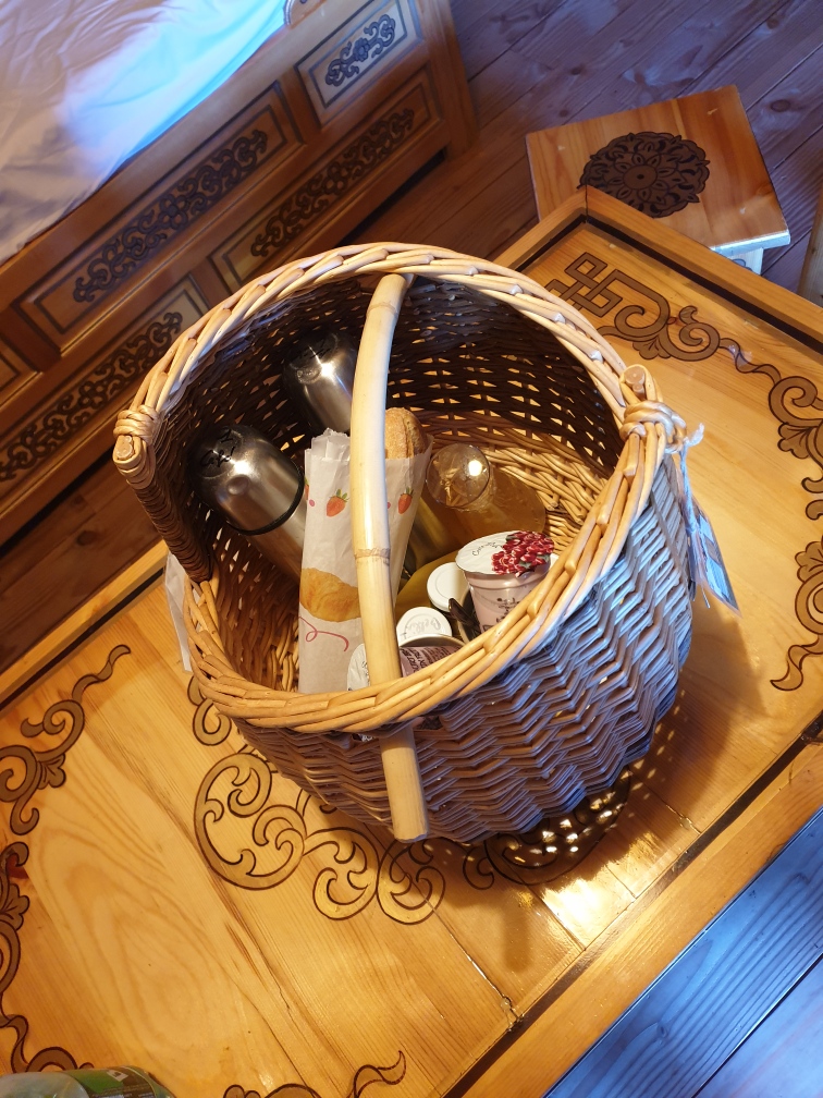 Le petit-déjeuner est déposé à 8h45 devant la yourte dans un panier. Si vous êtes en cabane, il est hissé par corde au sommet de votre terrasse. Pour 10€, il comporte 2 viennoiseries/personne, un yaourt fermier, 1/2 baguette, confiture maison, beurre, café (ou chocolat chaud ou thé) et jus de pomme.