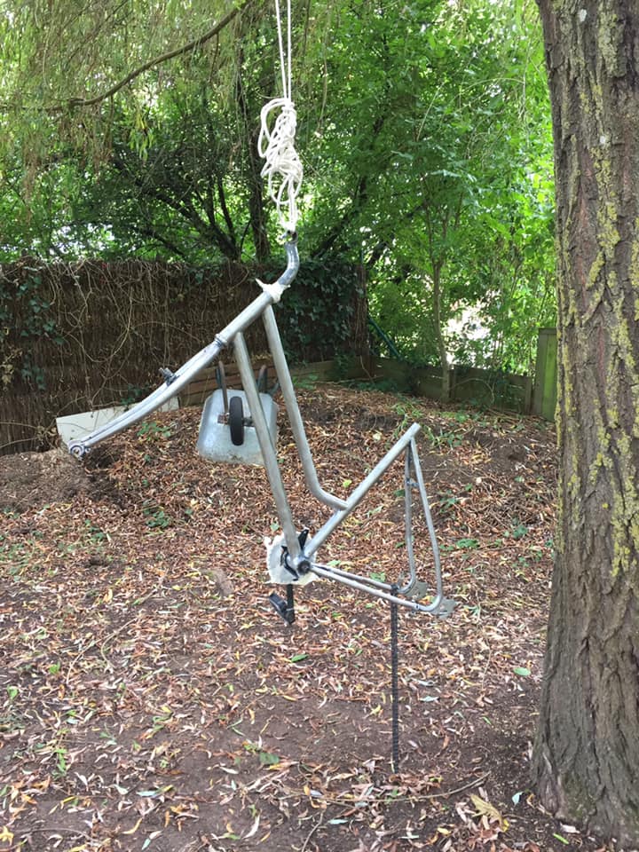 En repartant vers Chinon après cette visite, notre charrette a rendu l’âme. Bien emmerdés car en pleine campagne, il a fallu se résigner à blinder les sacoches de nos 2 compères de voyages et maintenir le reste avec tous nos tendeurs, en croisant les doigts pour qu’à Chinon, on puisse acheter ce qu’il faut. Par chance, un habitant (le seul dans un rayon de 15 km) est venu nous dépanner avec des boulons et des outils adaptés. C’est ça la Loire à vélo, des rencontres improbables ! Il nous a sauver la mise, on a pu ramener l’épave et toutes nos affaires au camping.