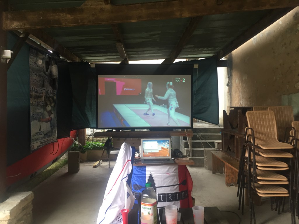 J’ai un peu oublié de vous dire que pendant cette semaine avait lieu les JO donc je me suis installée un petit écran pour ne rien louper, en somme, une sorte de séjour « vélo d’appartement » mais impossible de louper ça, et encore moins l’escrime. Il s’avère que sur notre périple nous sommes passés à Jarnac en repartant pour Saintes. Jarnarc est le village de Martin Thomas, Kayakiste qui a signé le meilleur temps des 1/2 finales mais hélas qui ne fera pas de podium. Son village a donc installé un écran géant et quand nous sommes arrivés, avait lieu la 1/2 finale de Manon au sabre dame ! Royal, surtout qu’à cette heure-ci, nous avons essuyé un orage, seule journée maussade du séjour.