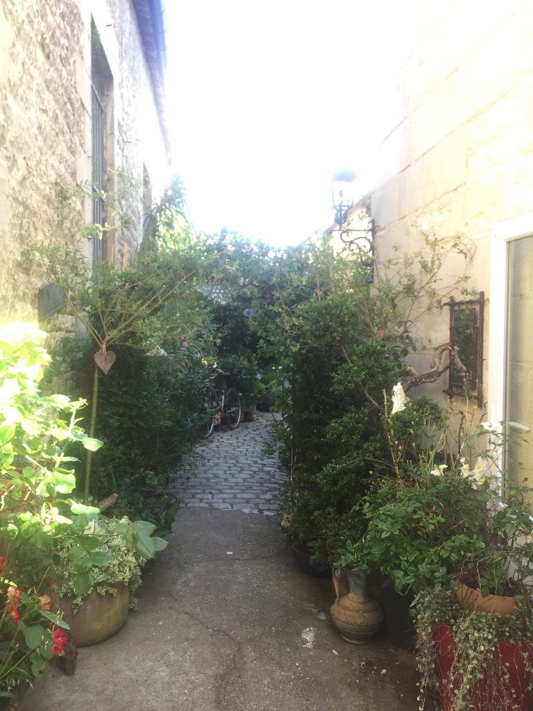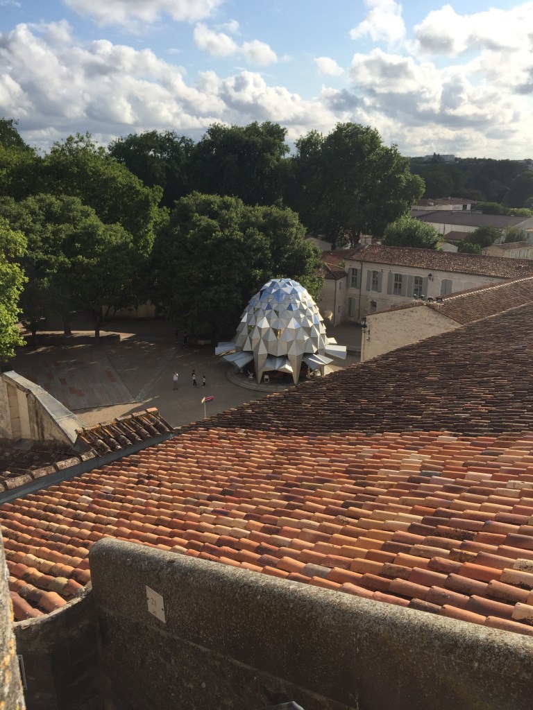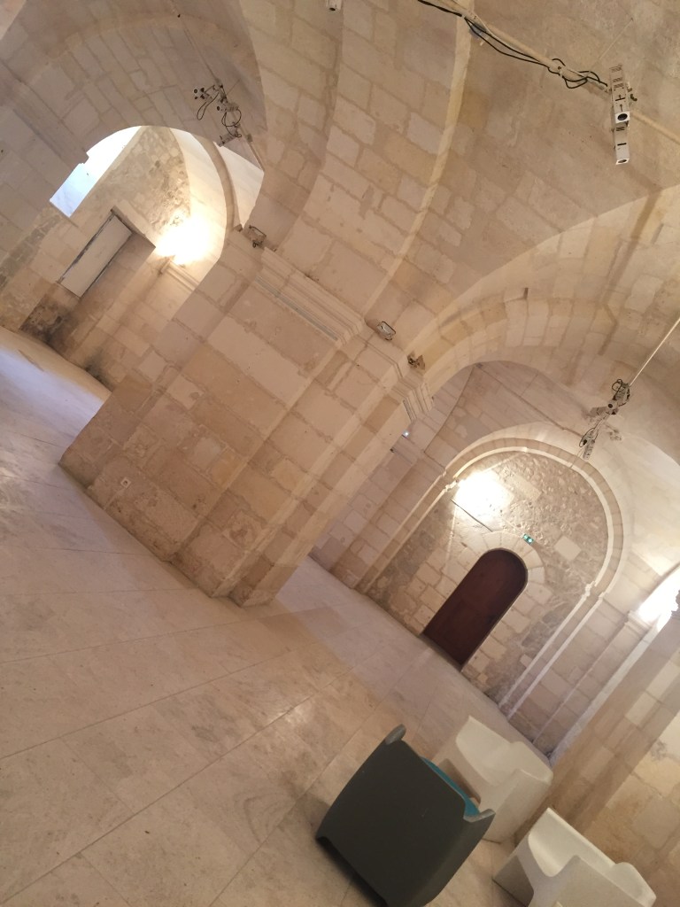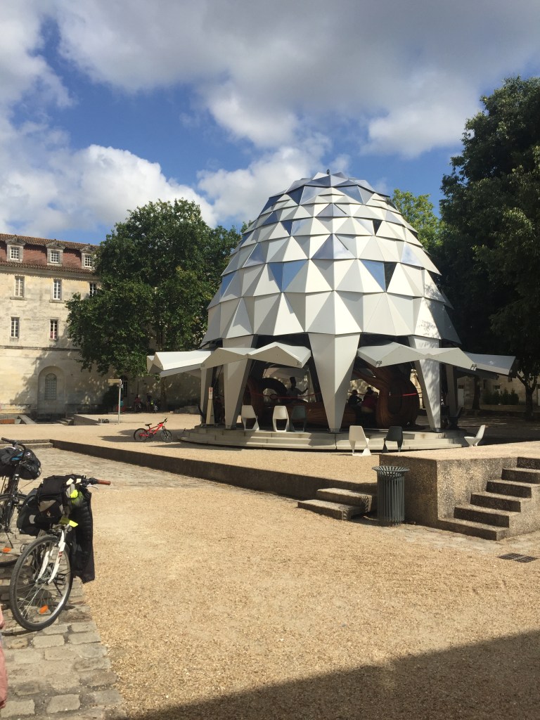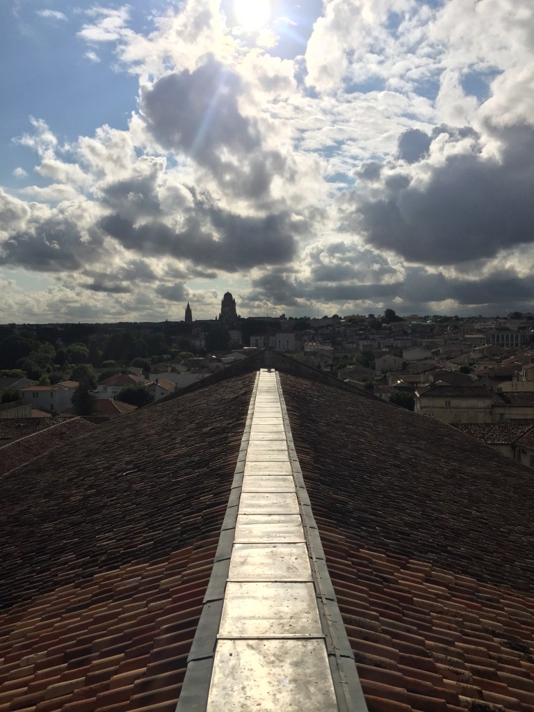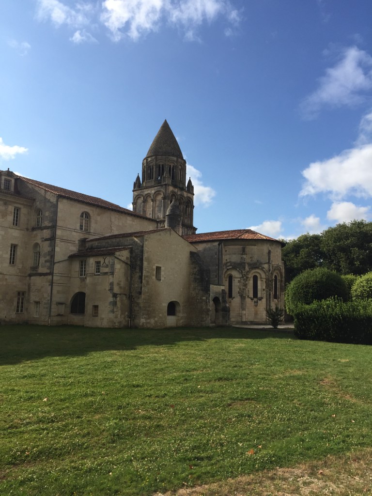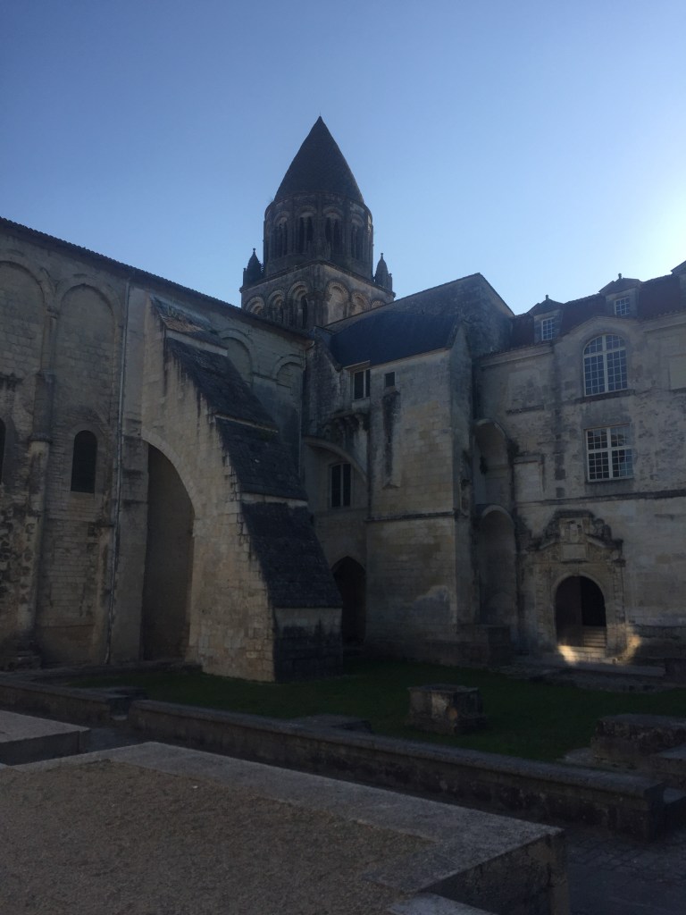 Arrivés à Saintes, nous avons posés nos vélos à l’abbaye aux dames, que je vous recommande absolument car, en plus de la visiter, nous y avons dormi (28€/pers). Le site est très beau, avec une visite en audio guide comme je n’ai jamais vécu avec de la musique plein les oreilles et une véritable immersion dans les lieux (visite gratuite si chambre réservée pour la nuit) avec en prime, une vue sur le toit de l’église. L’abbaye est également appelée la cité musicale…rien de mieux !
