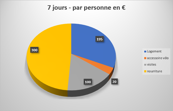Pour le budget de cette aventure, contrairement à la Loire à vélo, nous n’avons pas eu dans les dépenses l’achat du vélo, ni les accessoires de remise en forme du second vélo. Pour ces dépenses, vous référer à l’article de la Loire à Vélo.