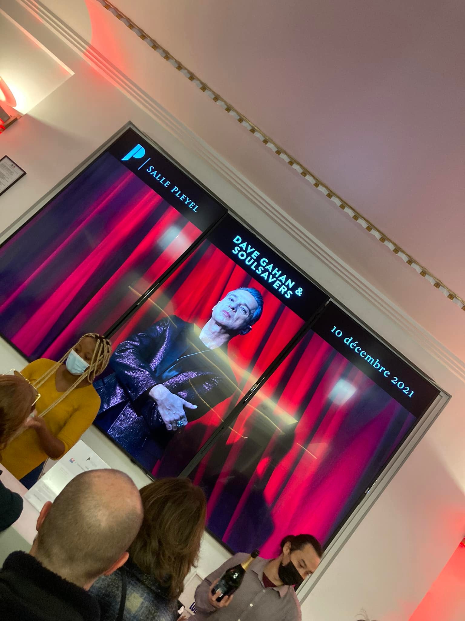 Arrivés salle Pleyel vers 19h sans avoir pris le temps de déposer nos affaires, nous voilà à la fouille, et dans le fond du hall, la trombine de Davinou. Putain ce n’est pas un rêve ! En passant au bar pour aller chercher un thé glacé au gingembre (et pas une bière, vous noterez, non pas ma maturité, mais simplement une prise d’antibio corsée qui aurait pu me coûter ce moment), j’entends un “et mais c’est Mélou”. Donc non ce n’est pas un rêve, la communauté DM est présente ! J’ai hésité à venir avec mon pull Depeche Mode car on vient voir Dave Gahan, qui a su éclore de son côté mais après tout, merde, je le porte assez souvent pour le laisser à la maison un soir comme celui-ci. Après avoir croisé des amis devotee, toujours cette impression, celle du temps qui s’est arrêté lors de notre dernier au revoir, à la tournée précédente. Cette famille dévouée, gentille et bienveillante. Cette famille qui est heureuse de se retrouver aux concerts pour refaire le monde, ou juste pour se donner les infos cruciales entre ceux du premier rang et du dernier “je te dis qu’il ne porte pas de slip sous son pantalon”.