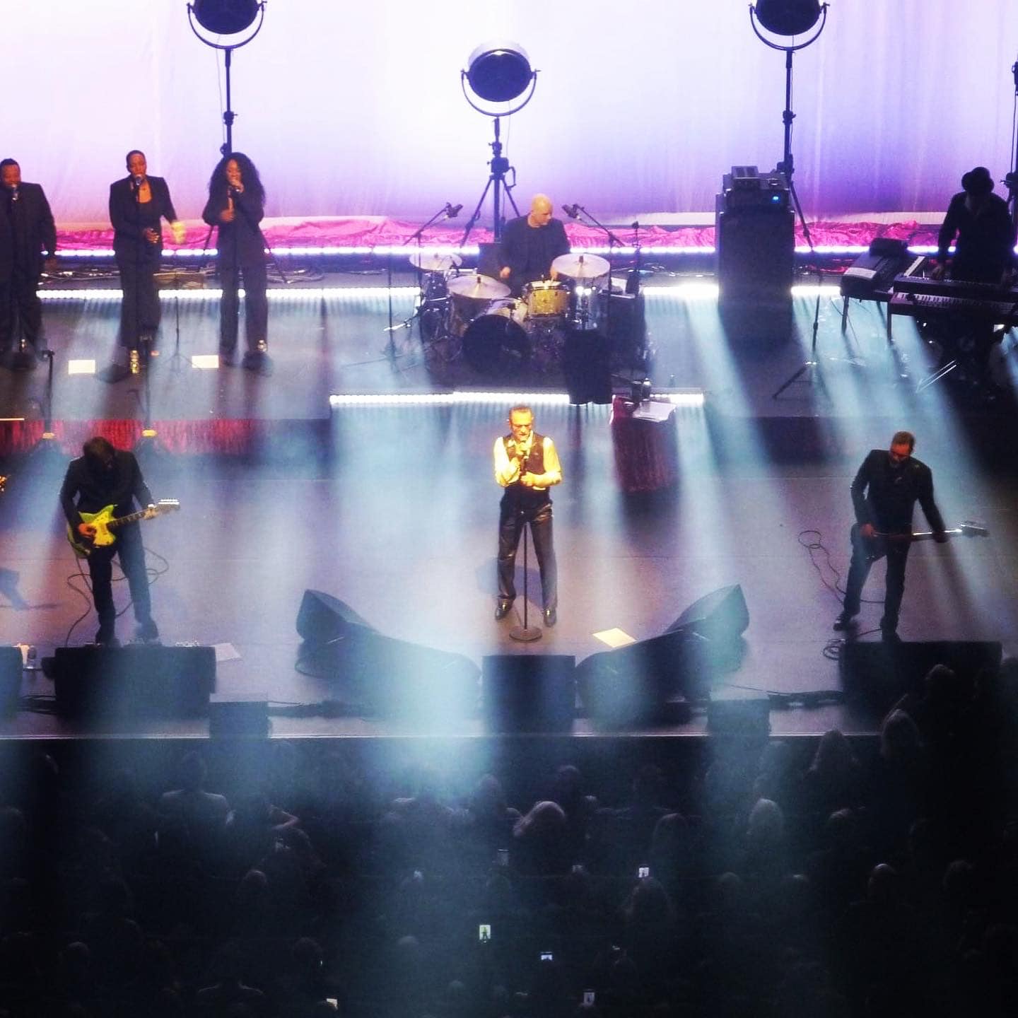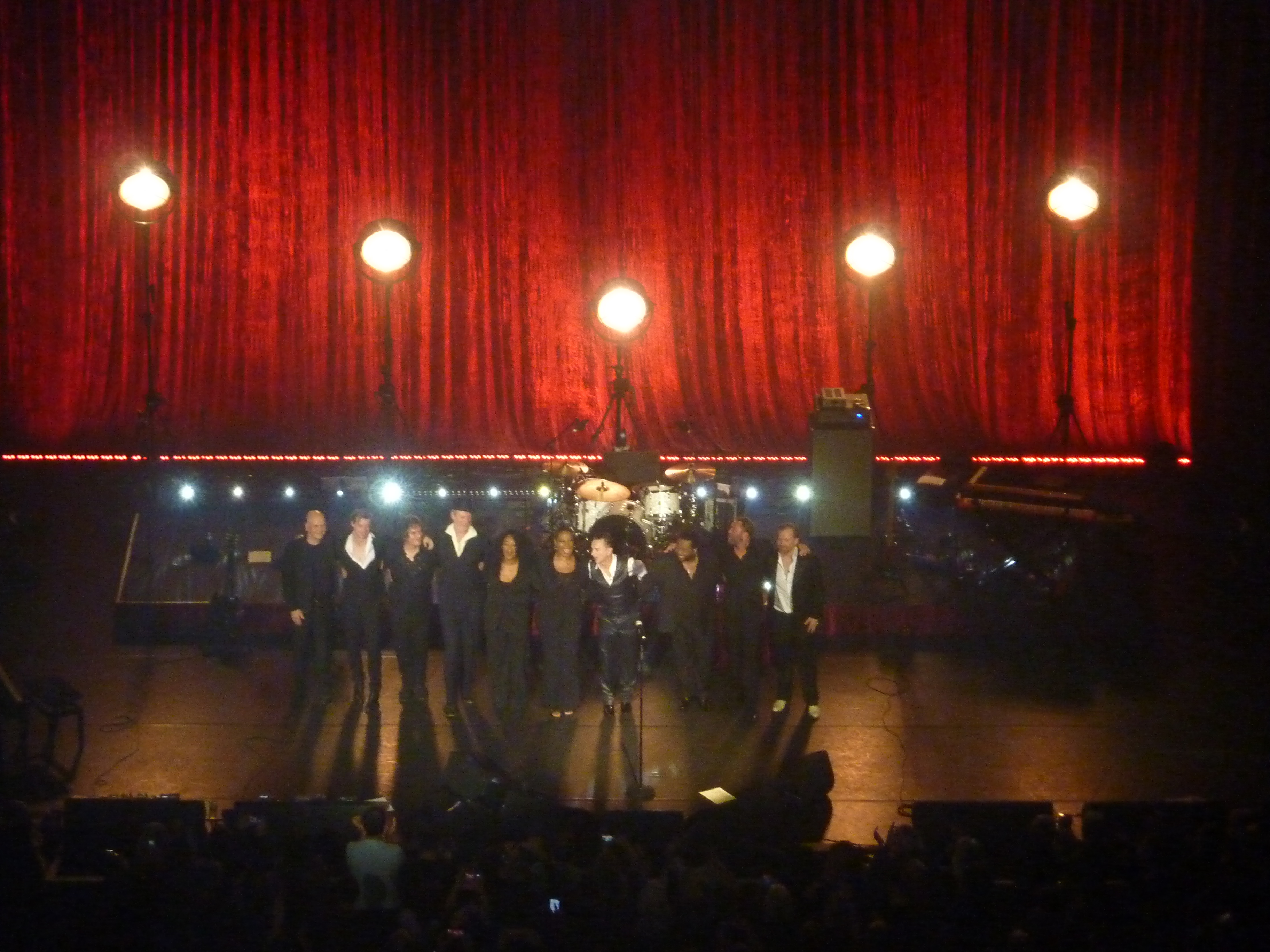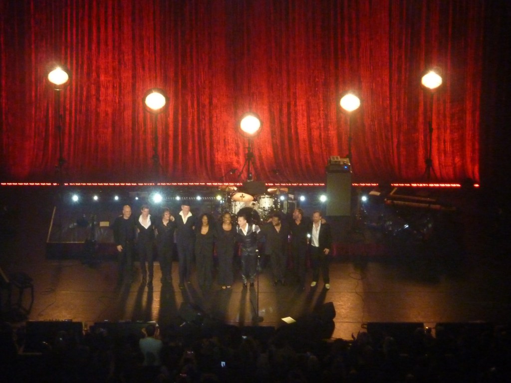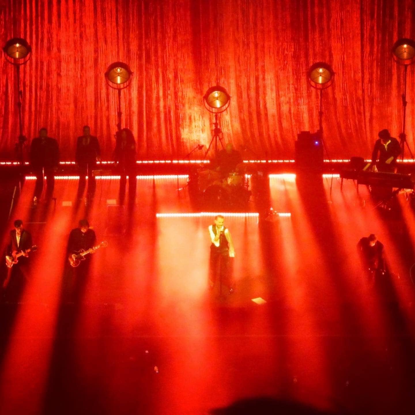 20h34, la salle est mise dans le noir et le rideau tombe, mon cœur avec. Un élan d’émotion m’envahit et qui m’avait tellement manqué ! Dave Gahan arrive enfin, vêtu de son habituel costume 3 pièces légèrement brillant, Pleyel l’acclame. Tantôt paire de lunettes sur le nez, tantôt sans, l’homme vieillit, il ne s’en cache pas. Ils sont 10 sur scène, scène surplombée d’un énorme rideau rouge et de 5 grands lampadaires style indus noir et doré, avec une estrade légèrement surélevée pour les 3 choristes, le batteur et claviériste. Dave Gahan trône au centre, entouré de 3 guitaristes dont Rich Machin et d’un bassiste. C’est parti pour 1h30 d’une qualité extraordinaire avec une première heure dédiée au dernier album de reprises, puis une seconde partie tout en contraste avec notamment 2 titres de Depeche Mode.