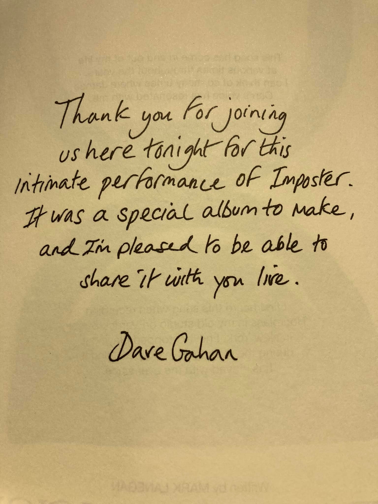 La scène est cachée à l’aide d’un grand rideau brodée d’un double visage peint au trait, tout comme la couverture du beau programme “A story of Songs” qui nous a été remis à l’entrée, gratuitement, par des hôtesses. Le programme nous offre un petit mot de Davinou écrit de sa main et présente chaque chanson de l’album Imposter avec le pourquoi du comment il a voulu reprendre tel ou tel titre. Dave Gahan souhaite vraiment nous offrir un moment d’intimité et nous donner toutes les clés pour que l’on déchiffre ses choix. Ces titres ne sont pas anodins pour lui et il lui semble important, avec cet album, de vouloir partager cela sans ambiguïté avec son public.