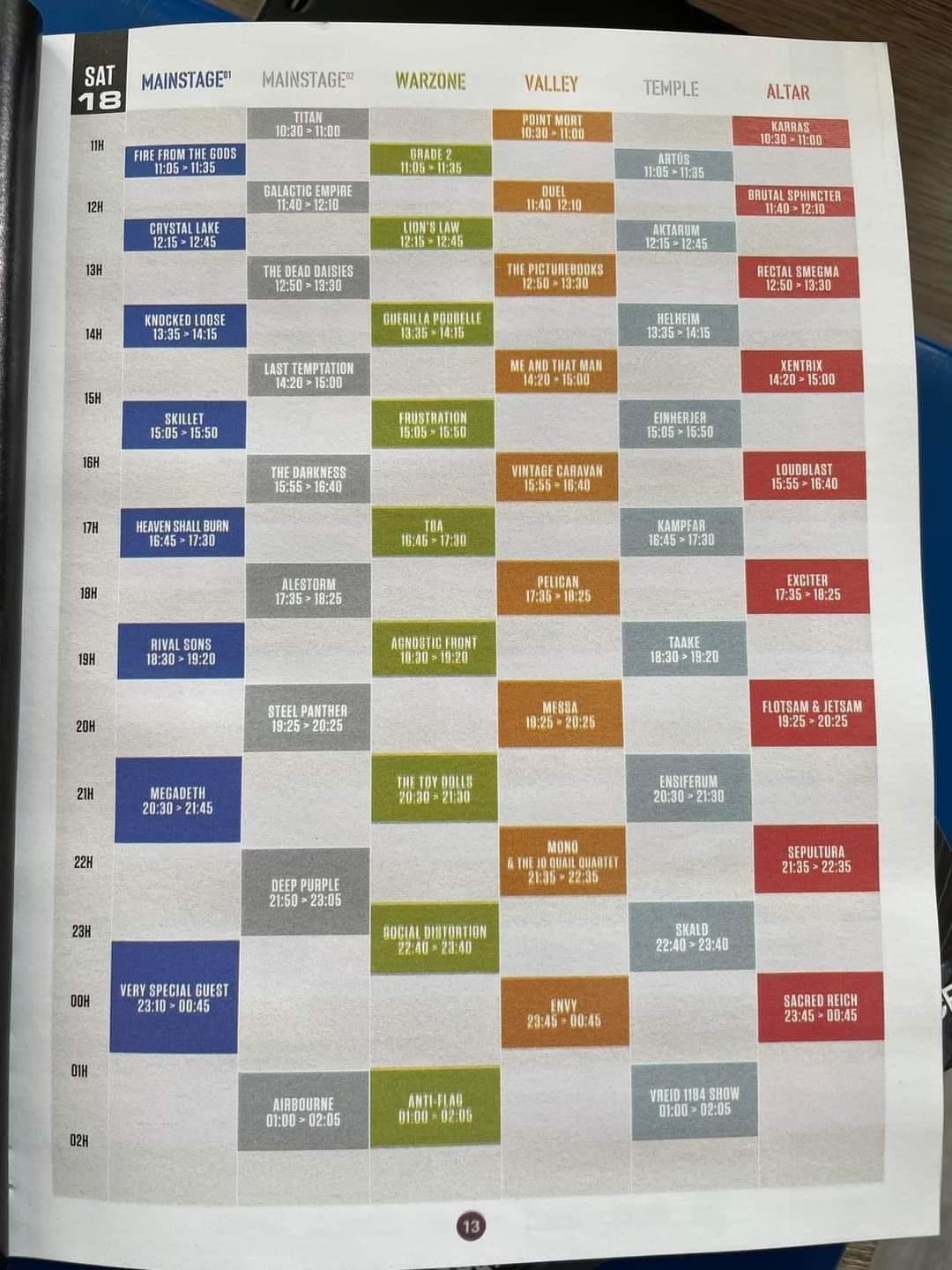 Rock Hard France a sorti le running order du Hellfest dans le n°230 avec Scorpions en couverture (les abonnés l’ont déjà reçu, sinon pour les autres, il sera disponible à partir du 8 avril). On va déjà commencer par ne pas être content comme on peut le voir ici, Envy a été mis en même temps que le Very Special Guest (qui devrait être dévoilé dans les prochains jours) :