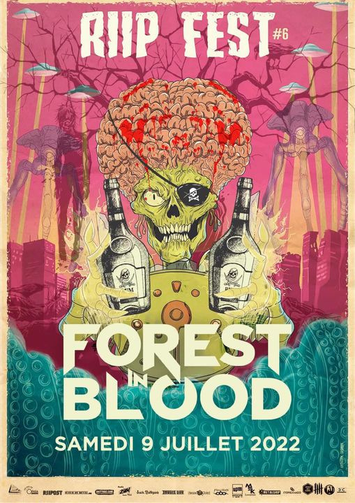 Actif depuis 1998, le groupe a sorti “Haut et Court” en 2020 mais n’a pas pu le défendre avec la crise sanitaire. C’est donc remontés à bloc et fraîchement revenus du Hellfest où ils ont fait l’ouverture sur la Hellstage, qu’ils ont littéralement retourné le Riip Fest. C’est un véritable coup de cœur. A vrai dire, ils savent y faire niveau accueil avec punch (préparé par la team Forest) offert pour les premiers rangs en entrée et en fin de set. Forest in Blood, c’est avant tout une histoire de pirates, de rhum Saint James, d’apérOOOooo et de gros son calibré ! La complicité sur scène est top, que ce soit entre le groupe et le public, qu’entre membres eux-même qui termineront par s’arroser mutuellement et inonderont la scène de Rhum et d’eau de source (il en faut un peu). On retiendra le guitariste jouant au milieu du pit qui se fera bousculer jusqu’à tomber à terre durant le Wall Of Death, l’ambiance de folie et le temps légèrement dépassé. Même si le groupe n’avait pas de retour son, ils ont assuré.