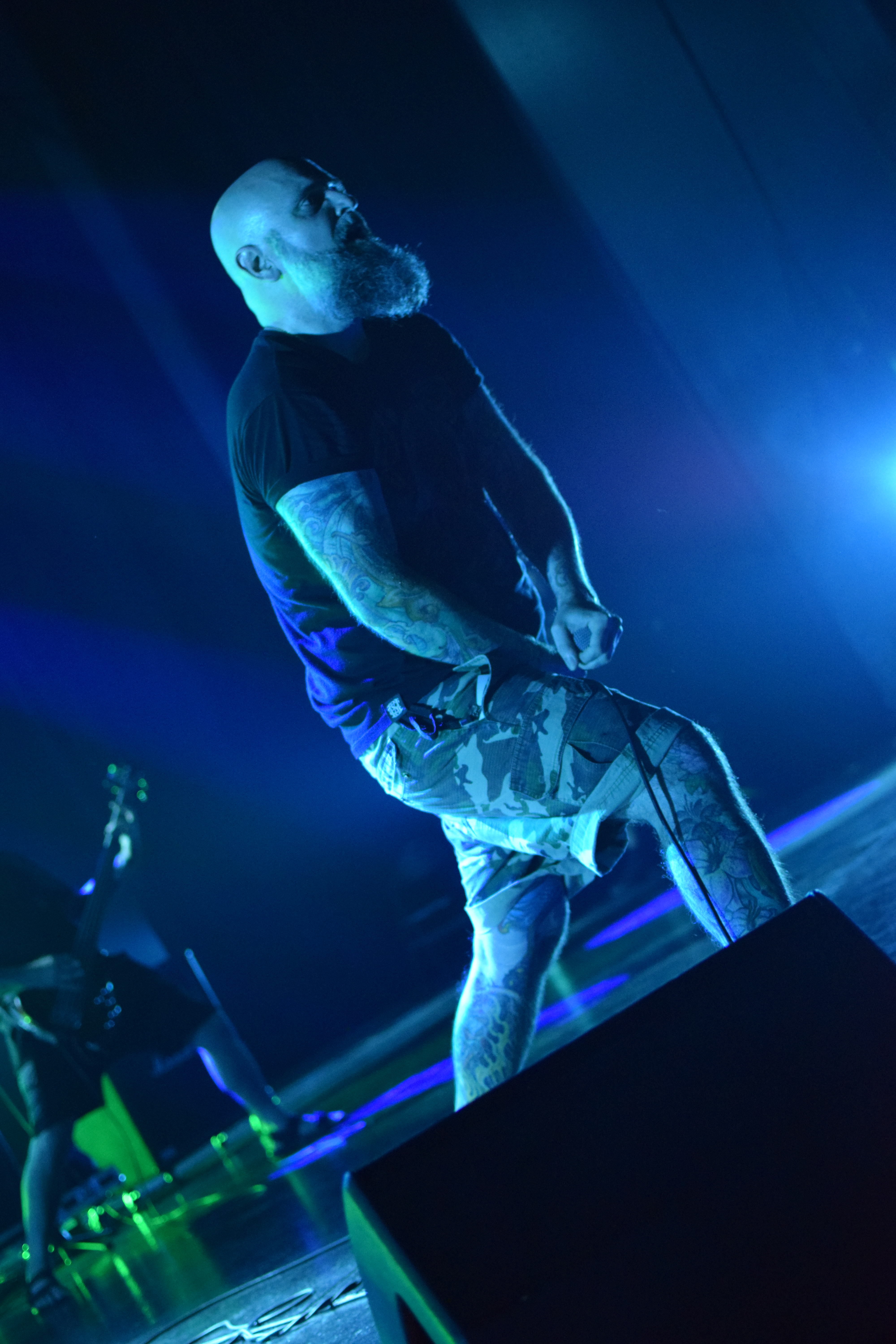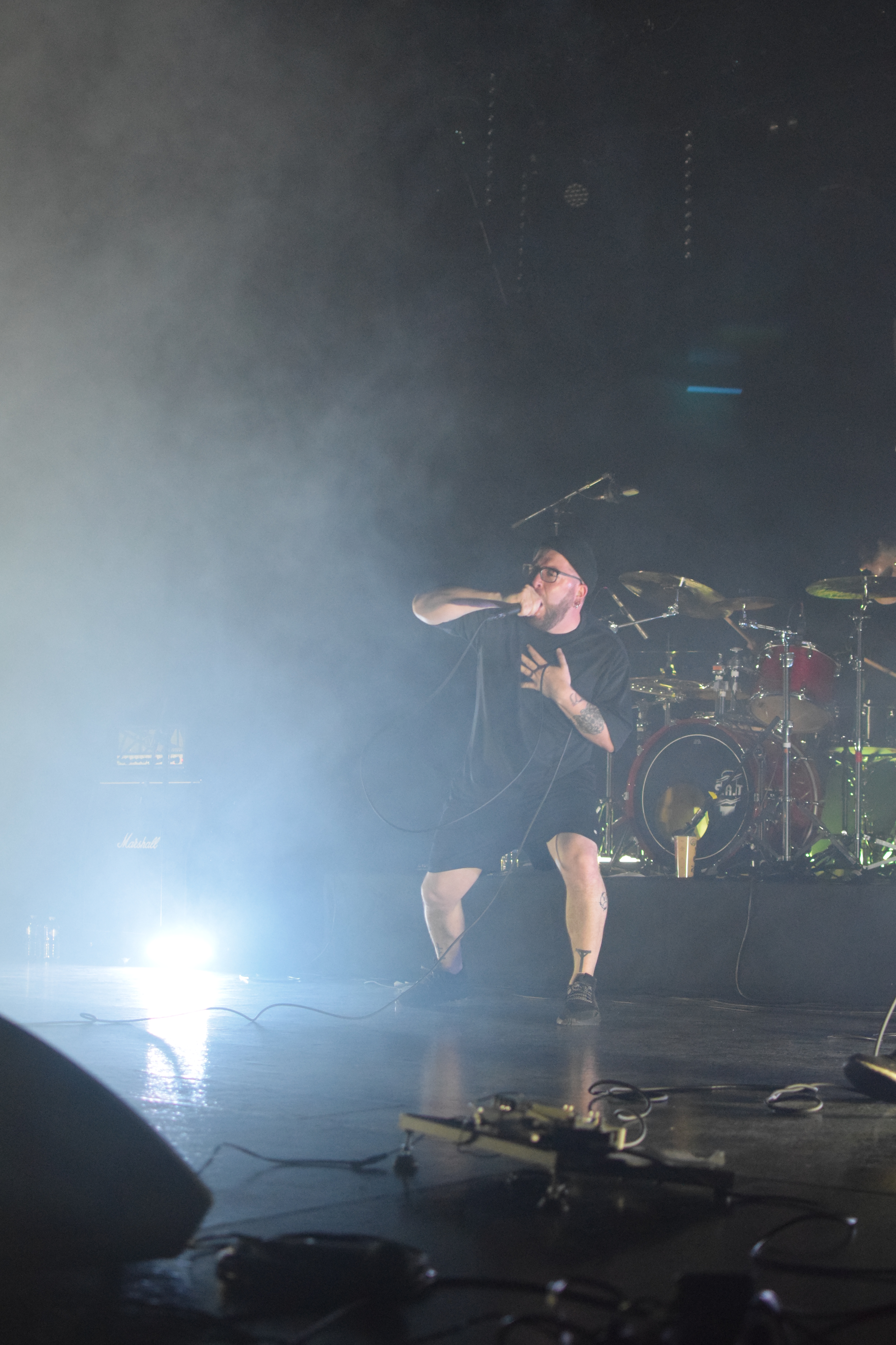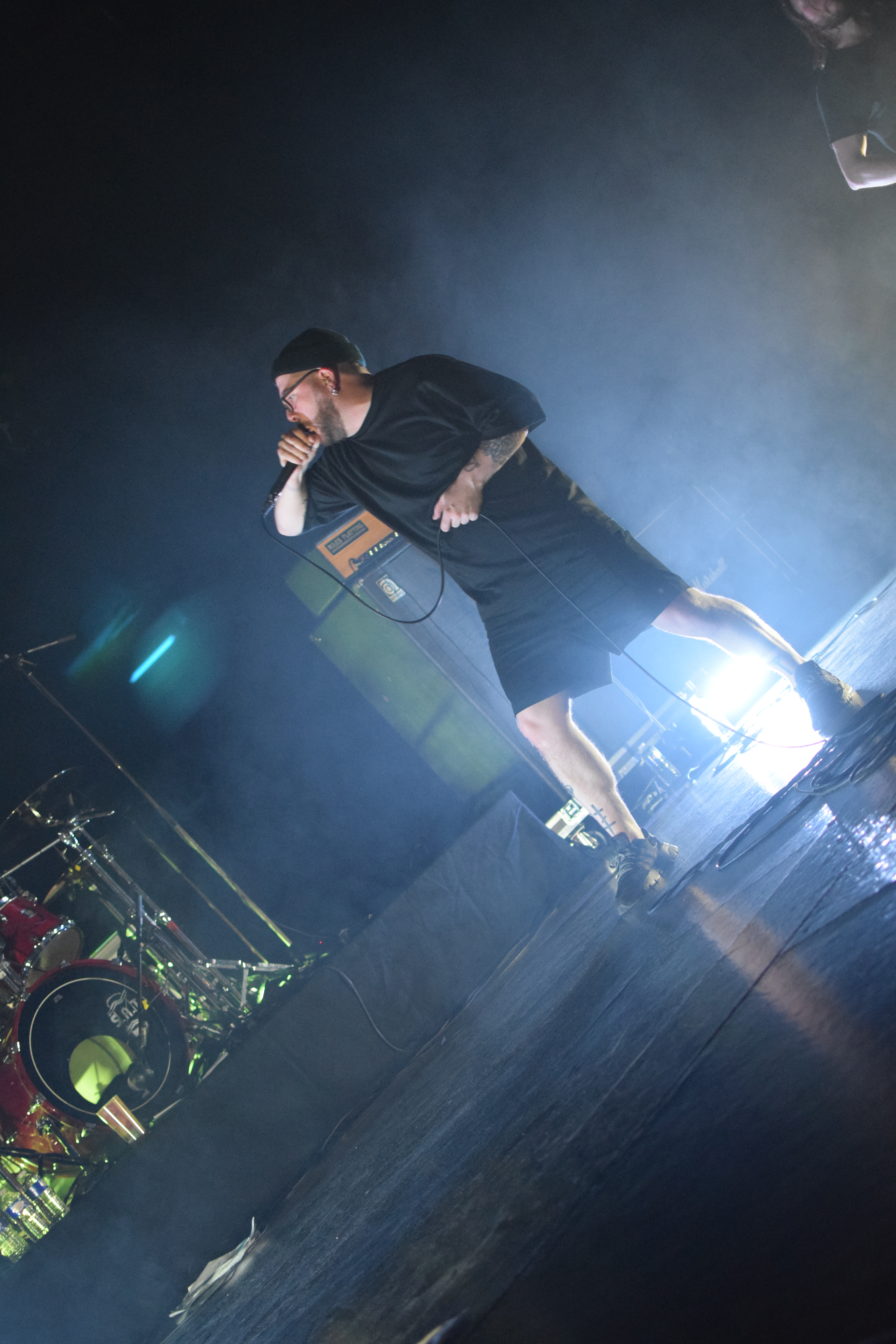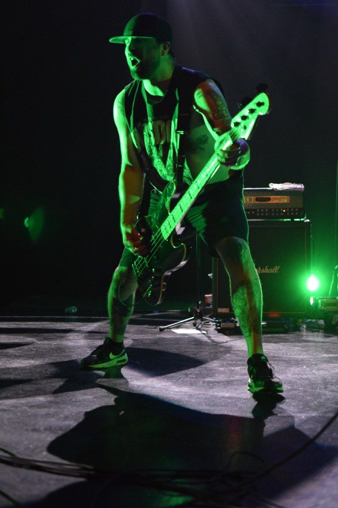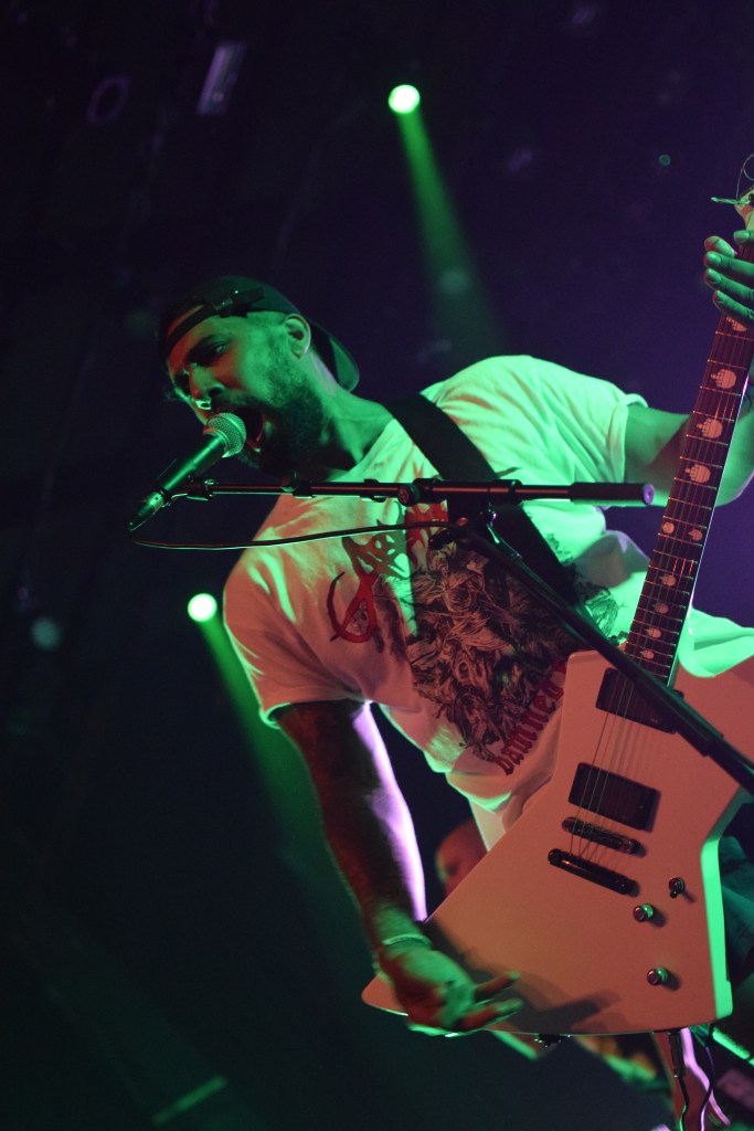 Ambiance tamisée et enfumée pour l’arrivée des Nantais, histoire de se mettre dans le bain sombre et glacial de leurs riffs. La lumière stroboscopique blanche, liée aux tapages de crâne du chanteur avec sa paume de main, créé un moment suspendu où le Hardcore flirt très légèrement avec le Black. C’est lourd, le pit s’ambiance, et surtout, se remplit