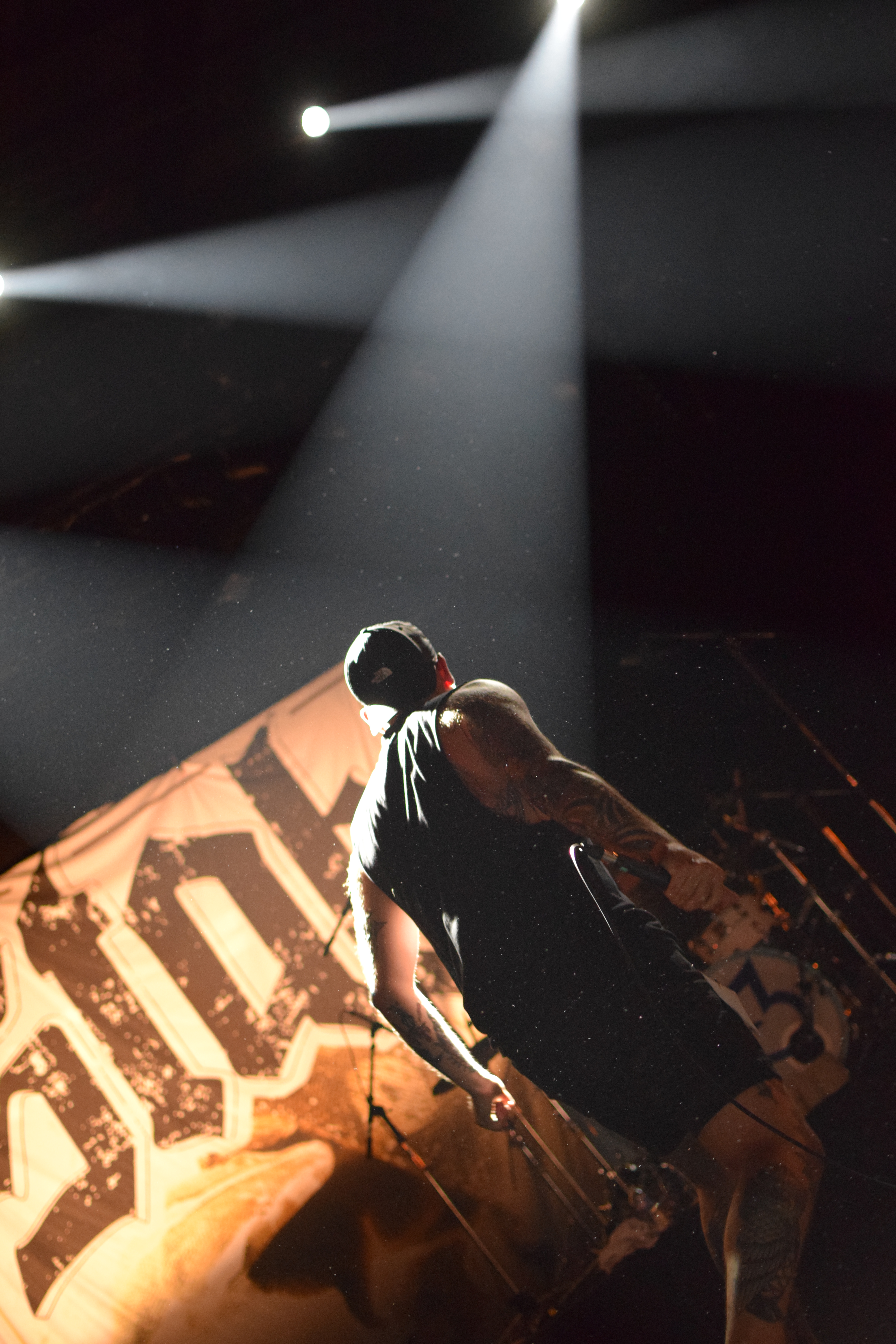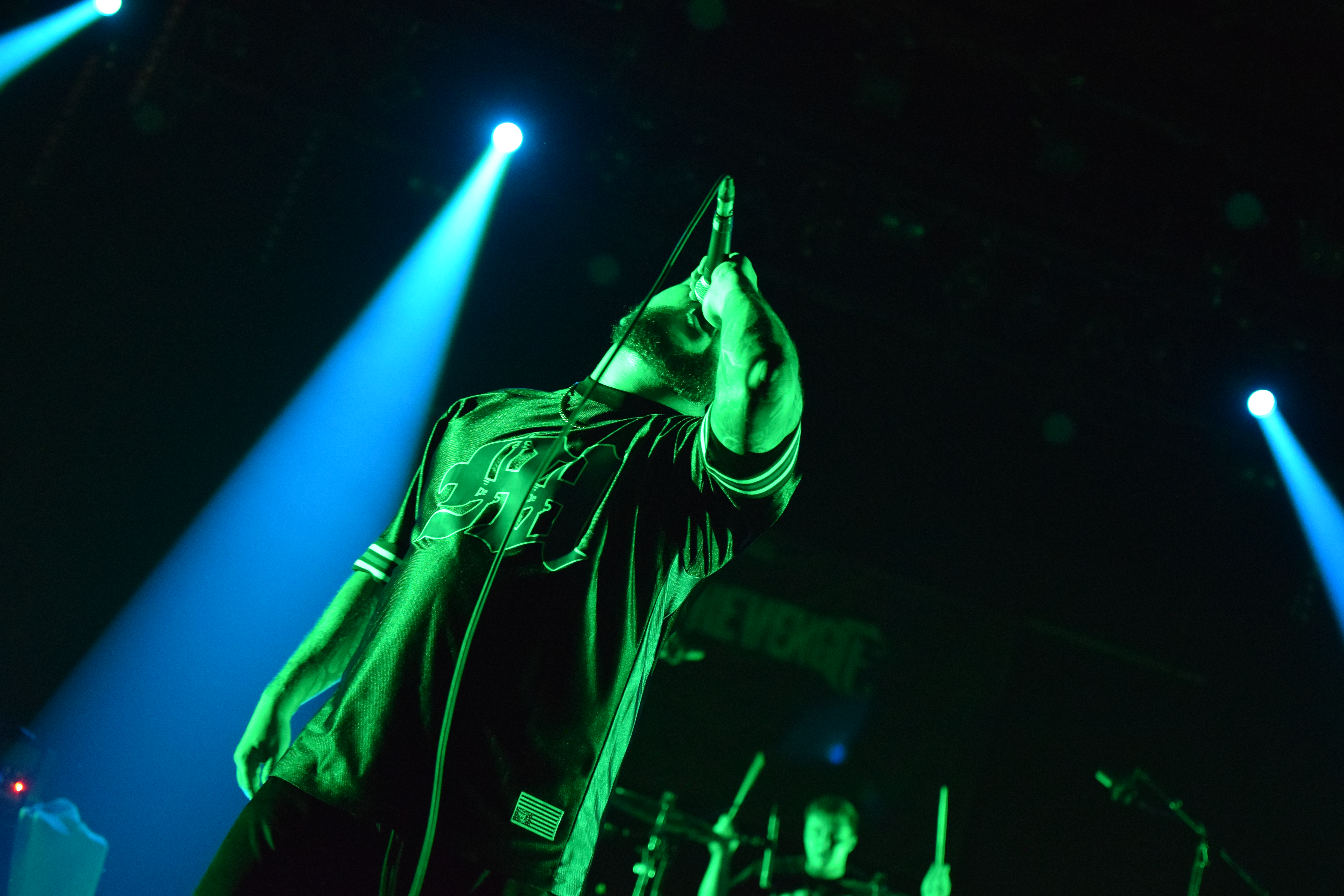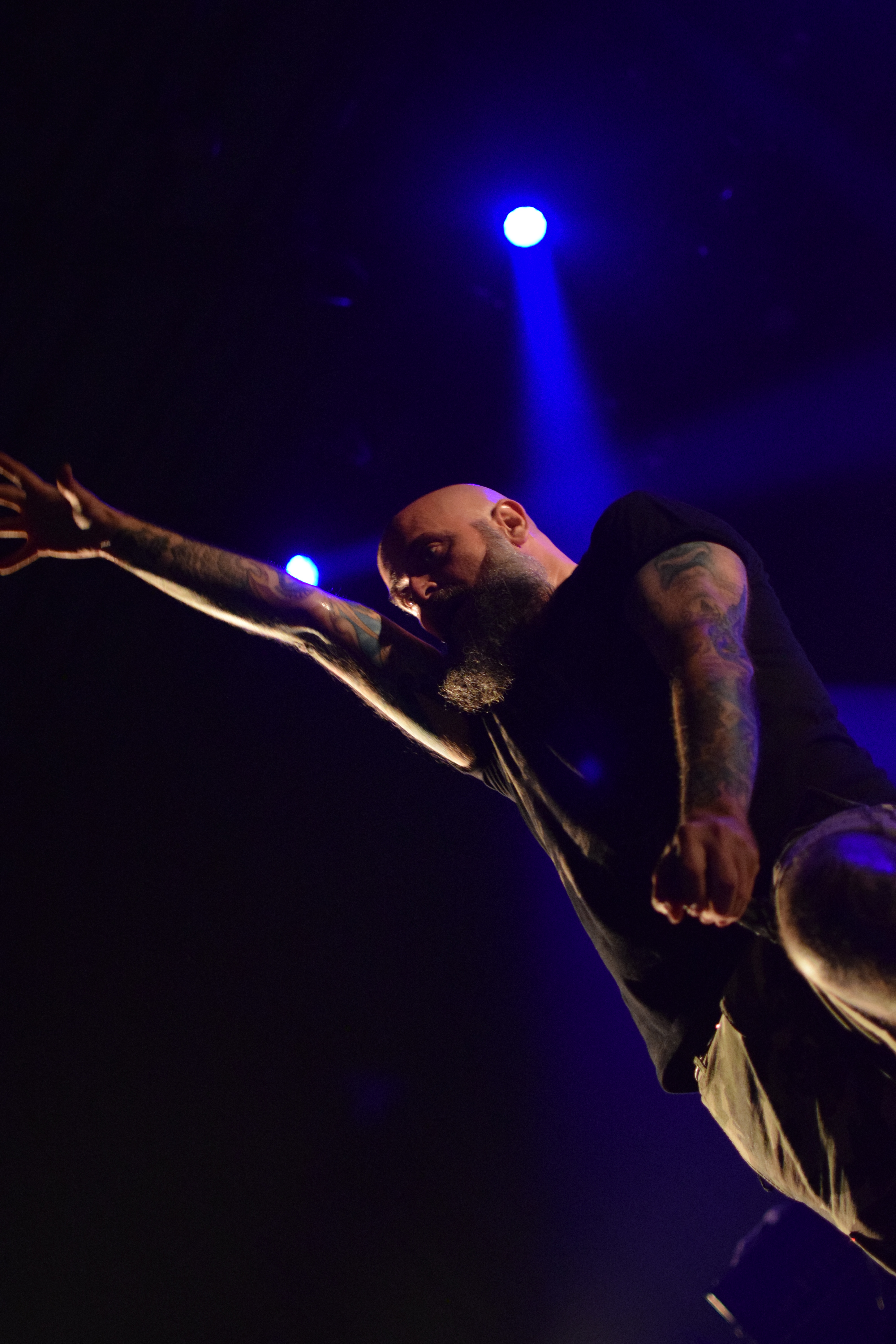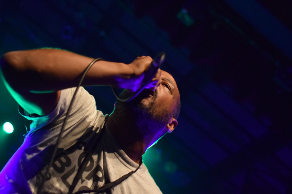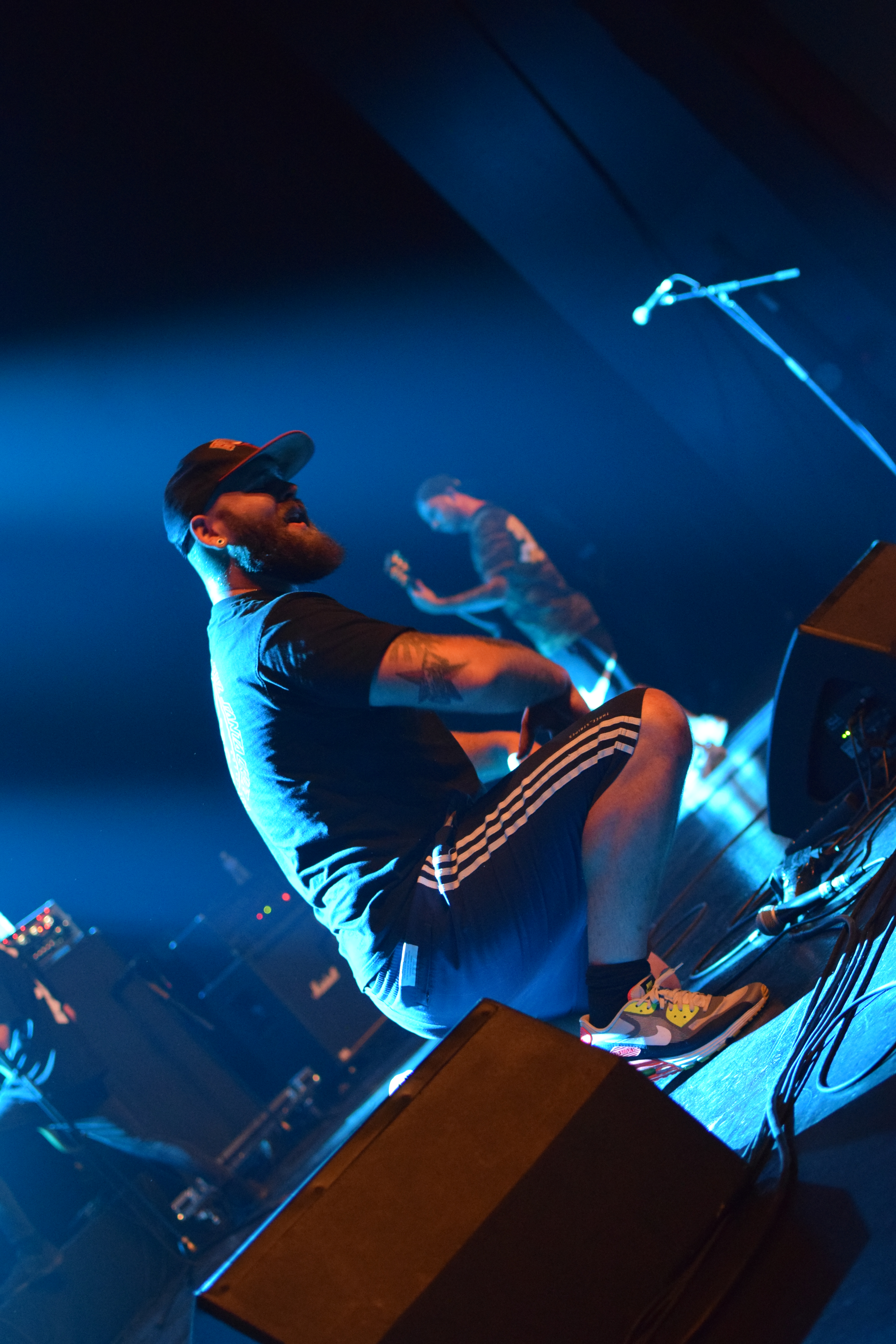 Ambiance tamisée et enfumée pour l’arrivée des Nantais, histoire de se mettre dans le bain sombre et glacial de leurs riffs. La lumière stroboscopique blanche, liée aux tapages de crâne du chanteur avec sa paume de main, créé un moment suspendu où le Hardcore flirt très légèrement avec le Black. C’est lourd, le pit s’ambiance, et surtout, se remplit