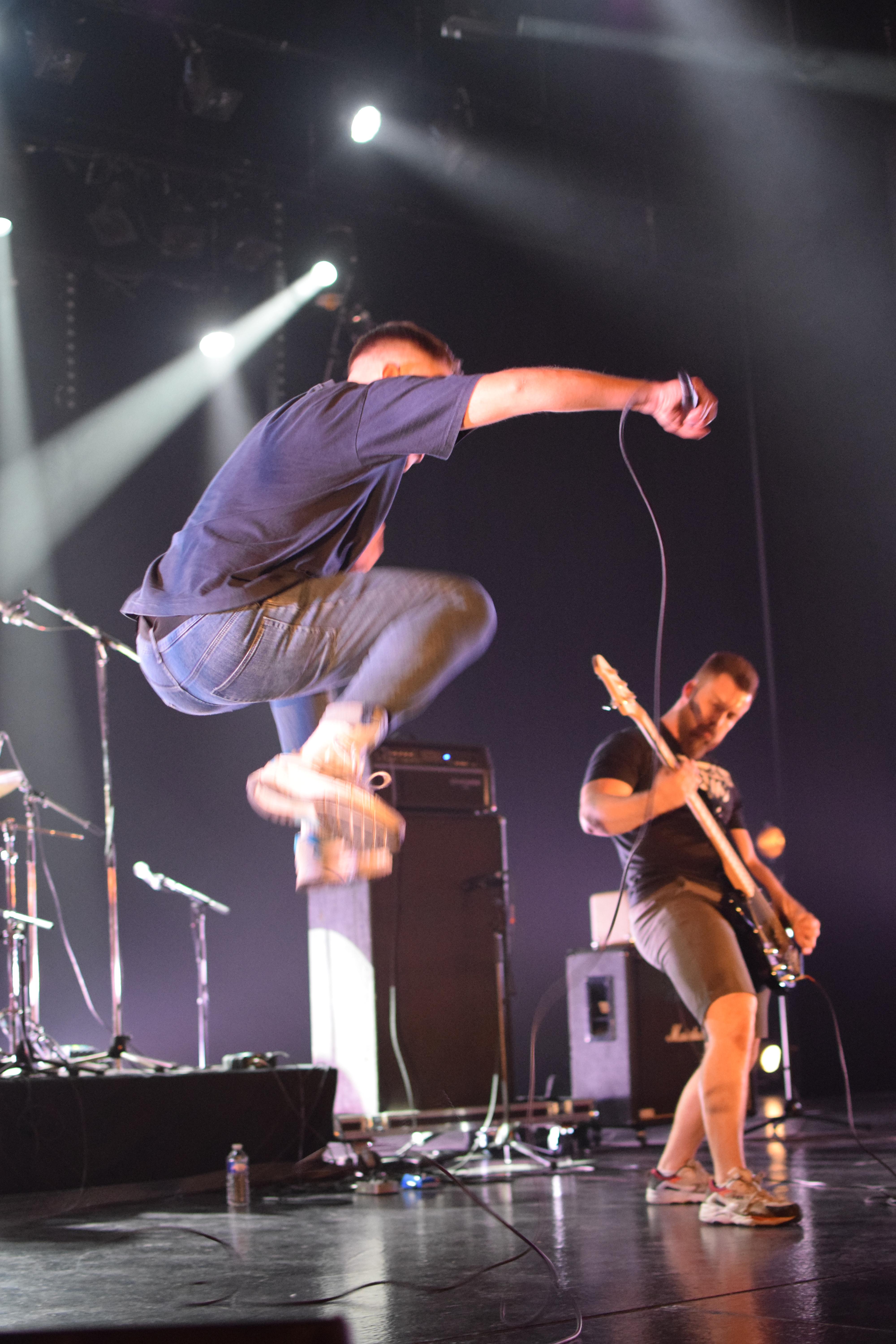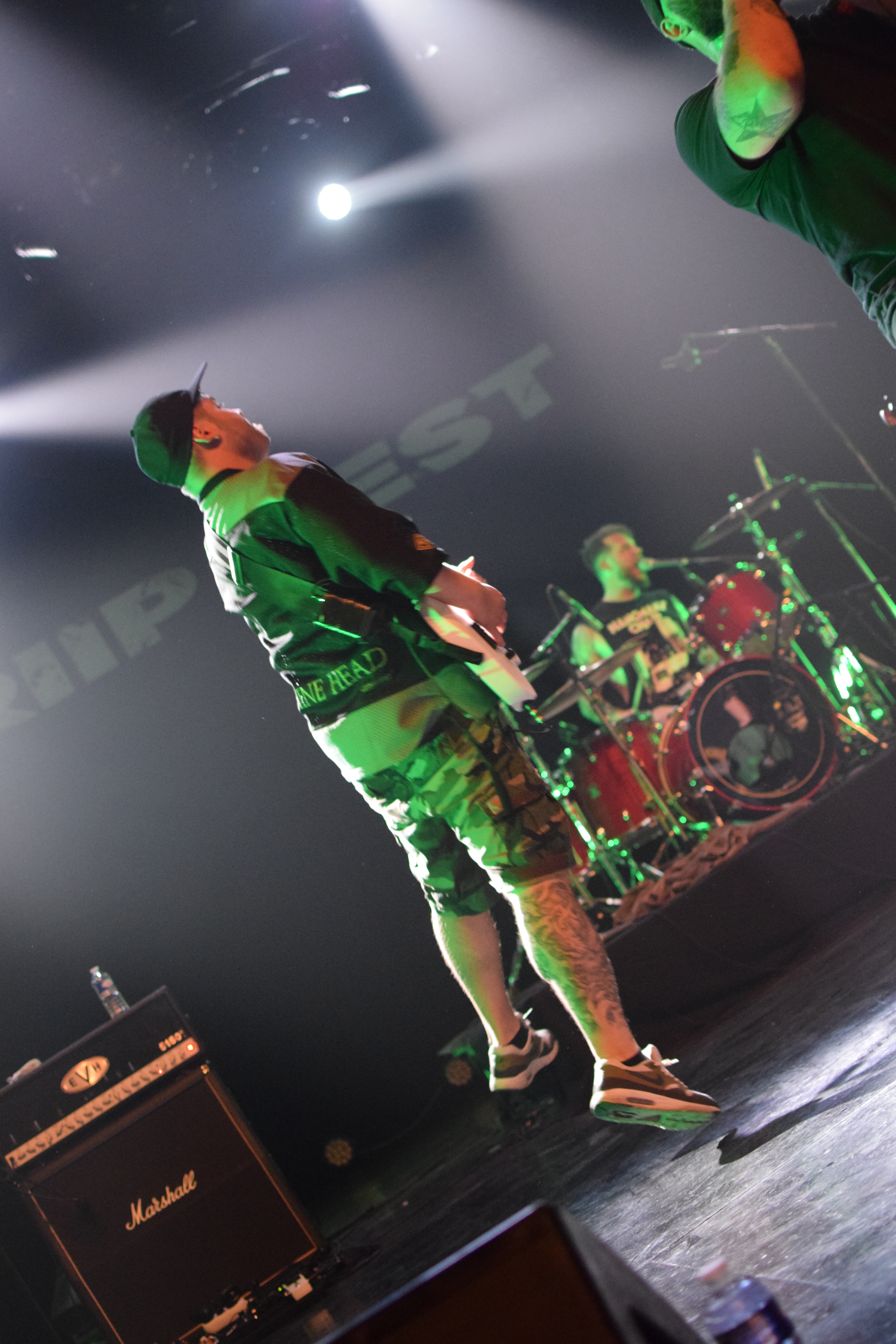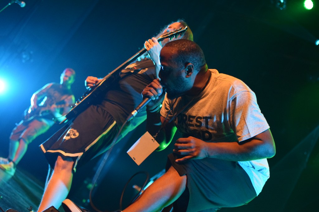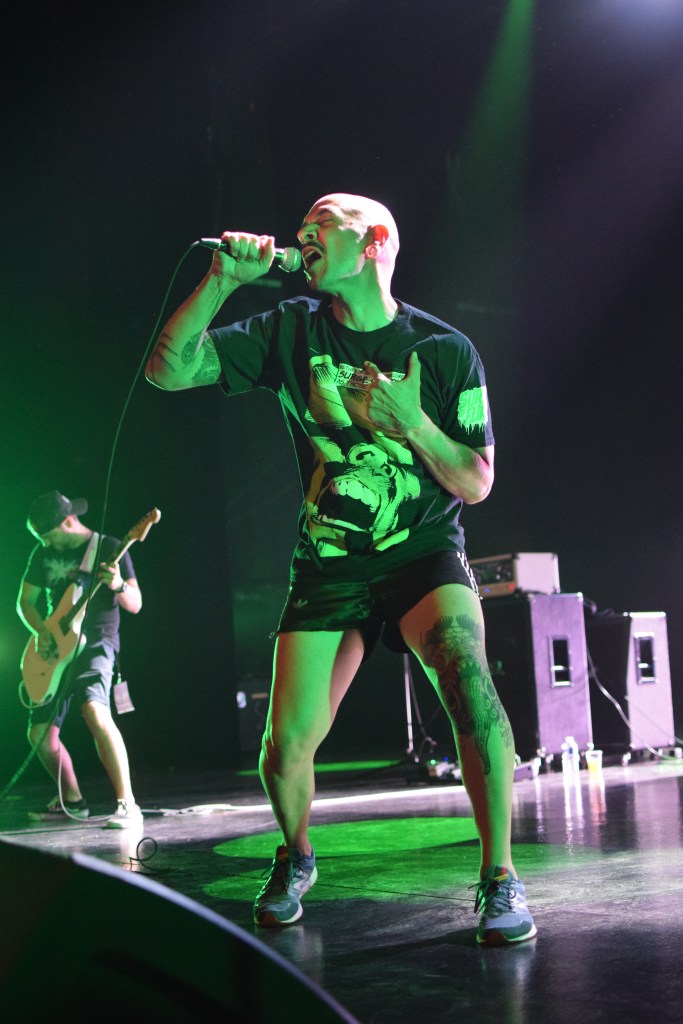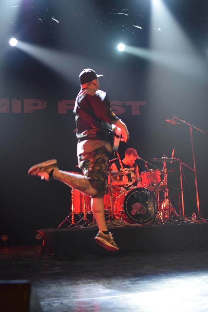 La salle est loin d’être pleine, il va donc falloir envoyer sec pour lancer le festival en ce premier jour. C’est donc armé de deux chanteurs (avec Kévin qui a rejoint le groupe en mai après le départ de Loïc) qui occupent le devant de la scène à tour de rôle dans une folle énergie en sautant et slamant, que Patent tente le pari de remuer le mosh qui commence à surchauffer.
