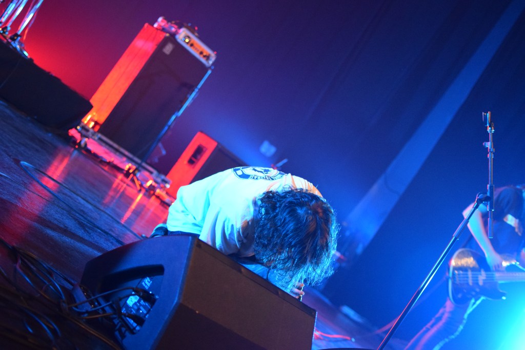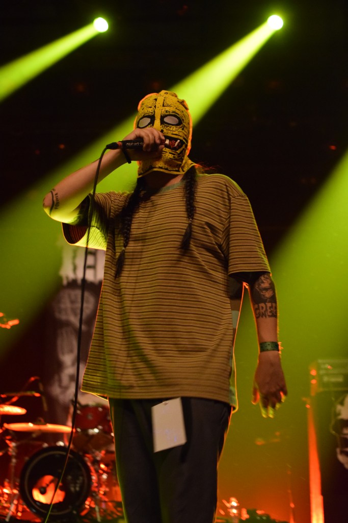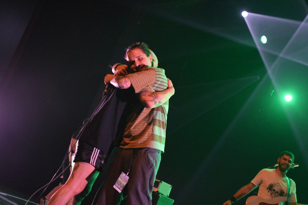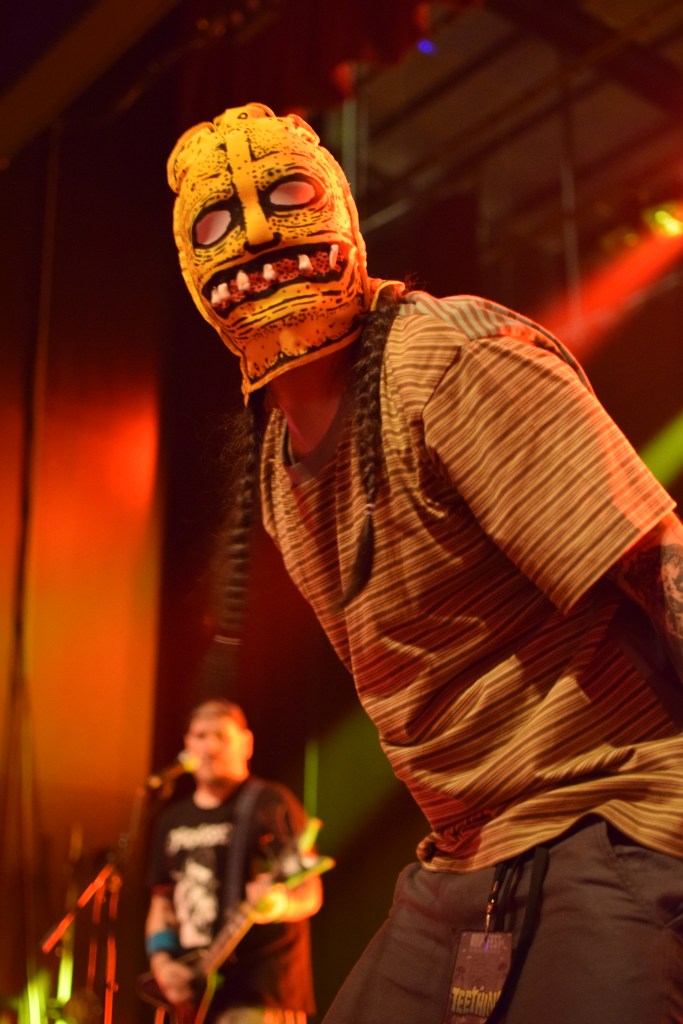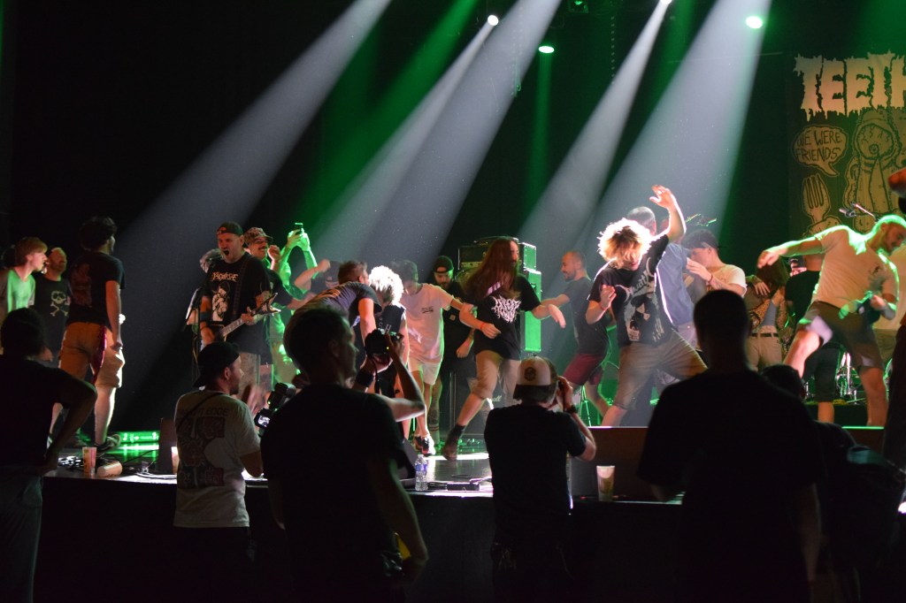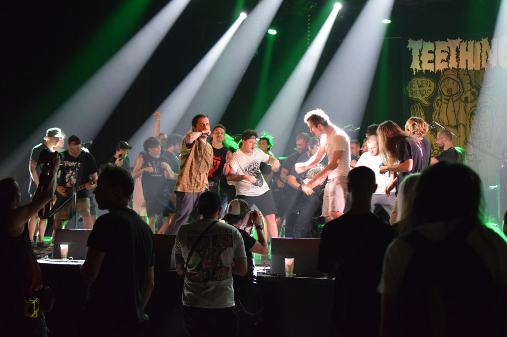 Habitués du fest avec déjà 2 participations, Teething a dû remplacer à la dernière minute le groupe TRC initialement programmé. Teething (trad : dent de lait) est le 1er groupe à afficher son nom sur scène sur une toile, avec un design assez flippant. L’arrivée sur scène sera des plus flippantes avec, Luis, le chanteur cagoulé à l’effigie d’un monstre difforme. Le set est très énergique avec un vrai partage avec le public que ce soit des tapes dans les mains des premiers rangs, le slam du chanteur ou encore son entrée dans le pit pour y chanter tout un titre. Le final sera d’autant plus marquant avec la montée sur scène d’une trentaine de festivaliers (appelés “babies”) invités à y faire la fête. Ce final sera aussi marqué par le retour d’Emile sur scène venu clôturer le set en duo avec Luis grimpé sur une chaise. Une folle ambiance et surtout une super camaraderie entre tous ces groupes et toujours dans la bonne humeur.