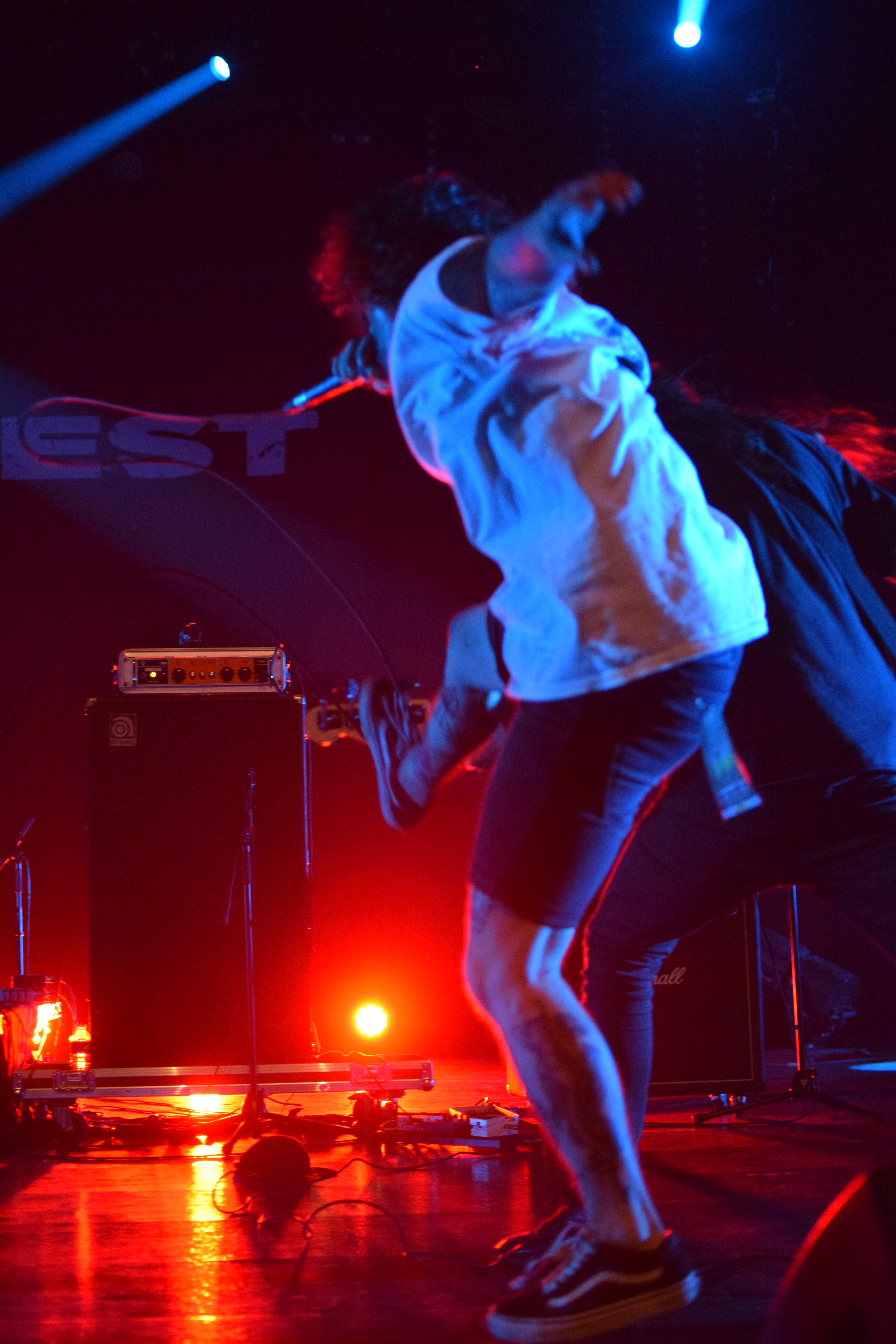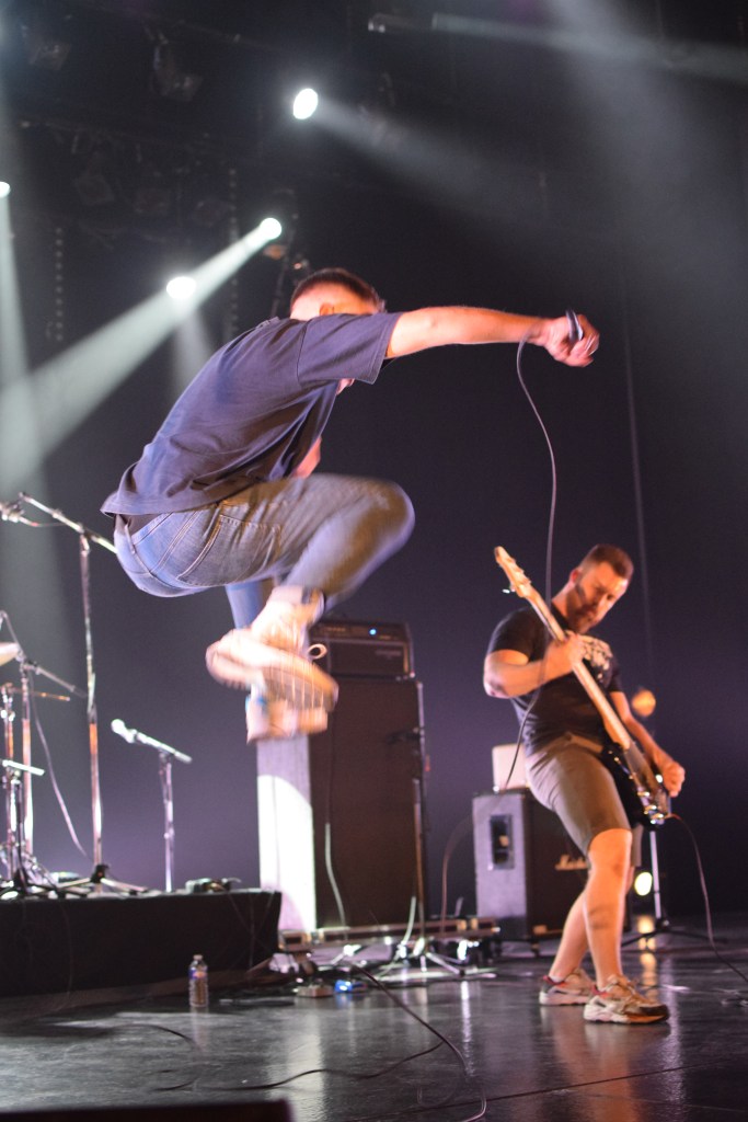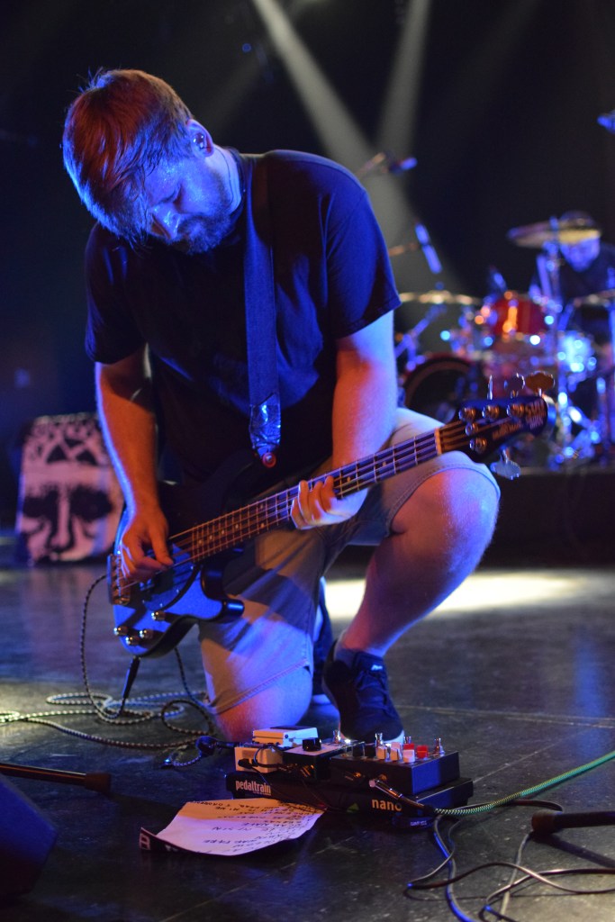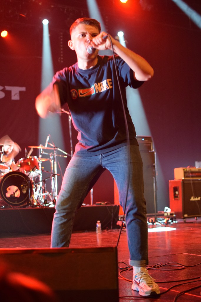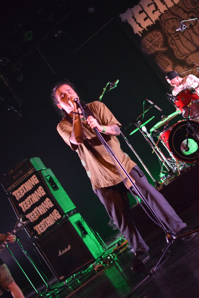 Habitués du fest avec déjà 2 participations, Teething a dû remplacer à la dernière minute le groupe TRC initialement programmé. Teething (trad : dent de lait) est le 1er groupe à afficher son nom sur scène sur une toile, avec un design assez flippant. L’arrivée sur scène sera des plus flippantes avec, Luis, le chanteur cagoulé à l’effigie d’un monstre difforme. Le set est très énergique avec un vrai partage avec le public que ce soit des tapes dans les mains des premiers rangs, le slam du chanteur ou encore son entrée dans le pit pour y chanter tout un titre. Le final sera d’autant plus marquant avec la montée sur scène d’une trentaine de festivaliers (appelés “babies”) invités à y faire la fête. Ce final sera aussi marqué par le retour d’Emile sur scène venu clôturer le set en duo avec Luis grimpé sur une chaise. Une folle ambiance et surtout une super camaraderie entre tous ces groupes et toujours dans la bonne humeur.