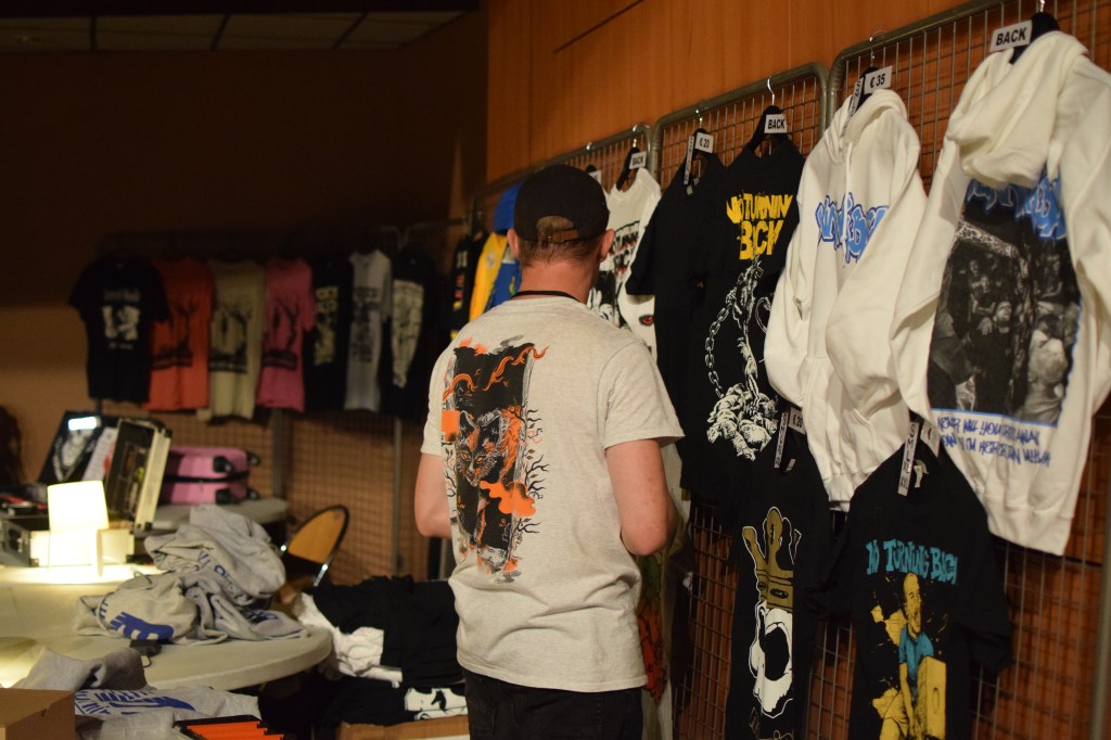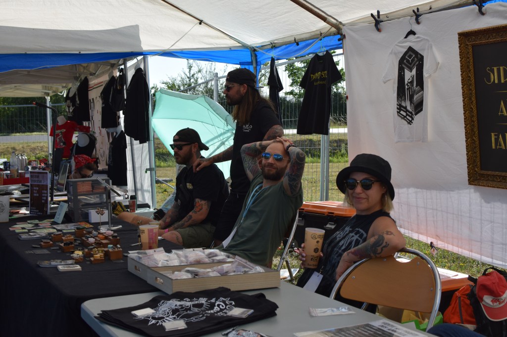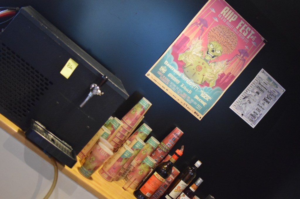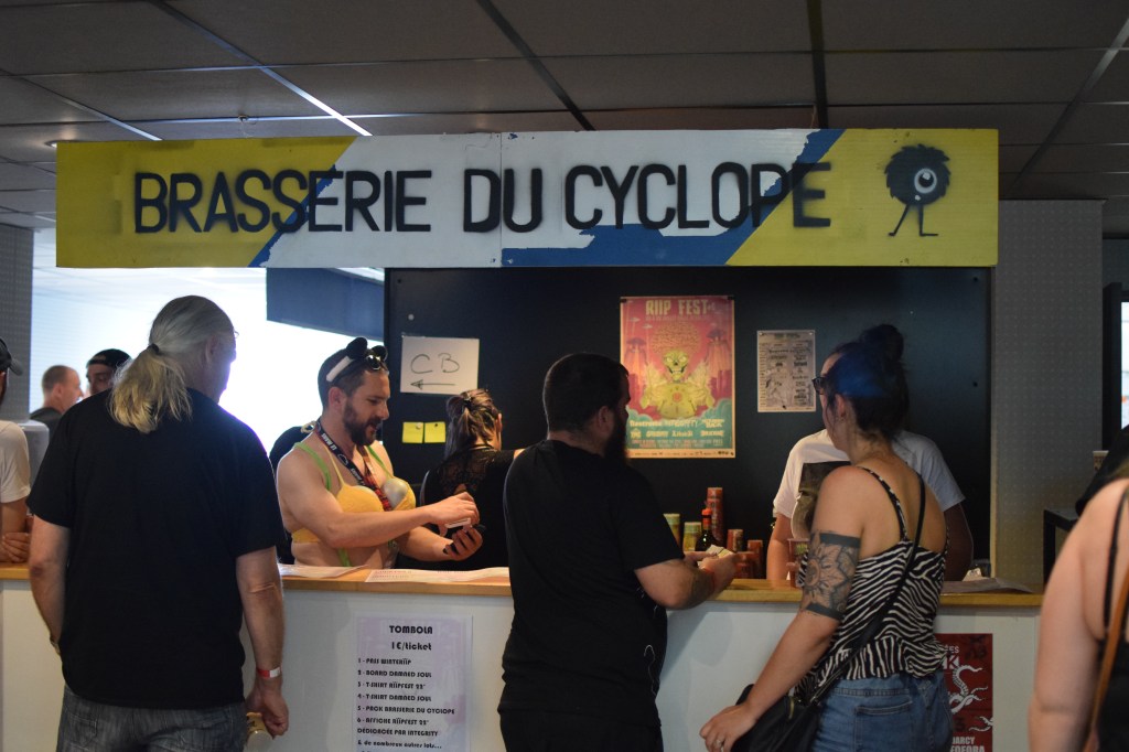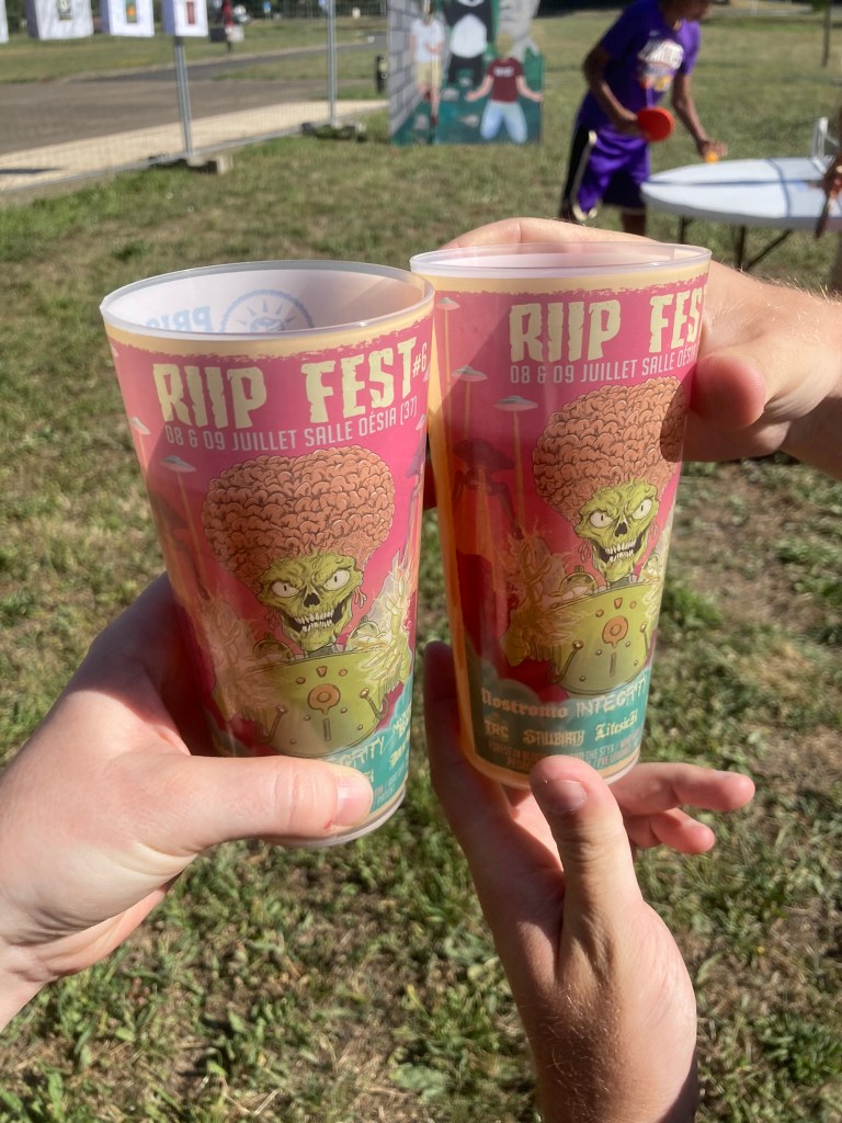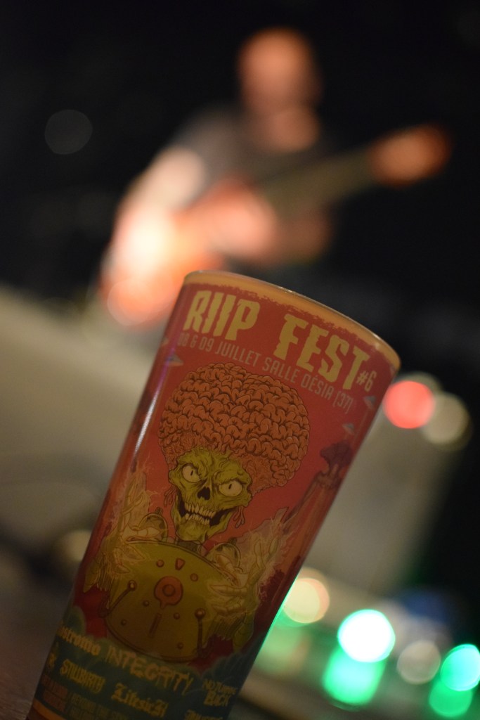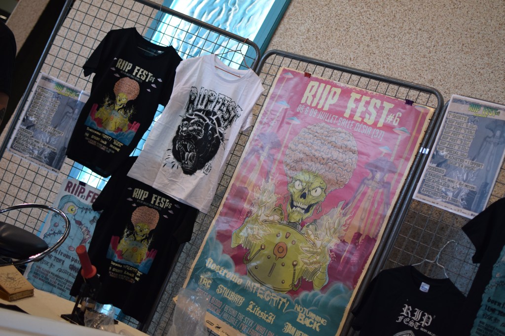 On aime le Riip Fest pour l’accessibilité des artistes qui vendent eux-même leur merch, l’équipe du Riip qui a toujours le sourire, et le rythme des concerts qui passent à une vitesse folle. Chaque set dure 30 min avec 30 min de pause entre chaque groupe, puis environ 1h pour les têtes d’affiche à savoir Nostromo et Integrity. Ce rythme permet de voir 9 groupes entre 15h30 et 23h30, sans être trop dans le dur de la fatigue et davantage, si un groupe nous plaît moins, le temps passe assez vite. Les temps de pause quant à eux sont animés par un bar proposant bières, vins et soft, un espace mangeage, des stands exposants (vêtements, bijoux, skates …), le merch officiel du Riip avec T Shirt (dont un limité créé par Street Art Family), affiches, pins …, un espace Merch officiel des groupes présents, et une prairie aménagée pour jouer au ping-pong ou siester ! Et si vous voulez prolonger la soirée, il y a DJ set karaoké jusqu’à 2h.