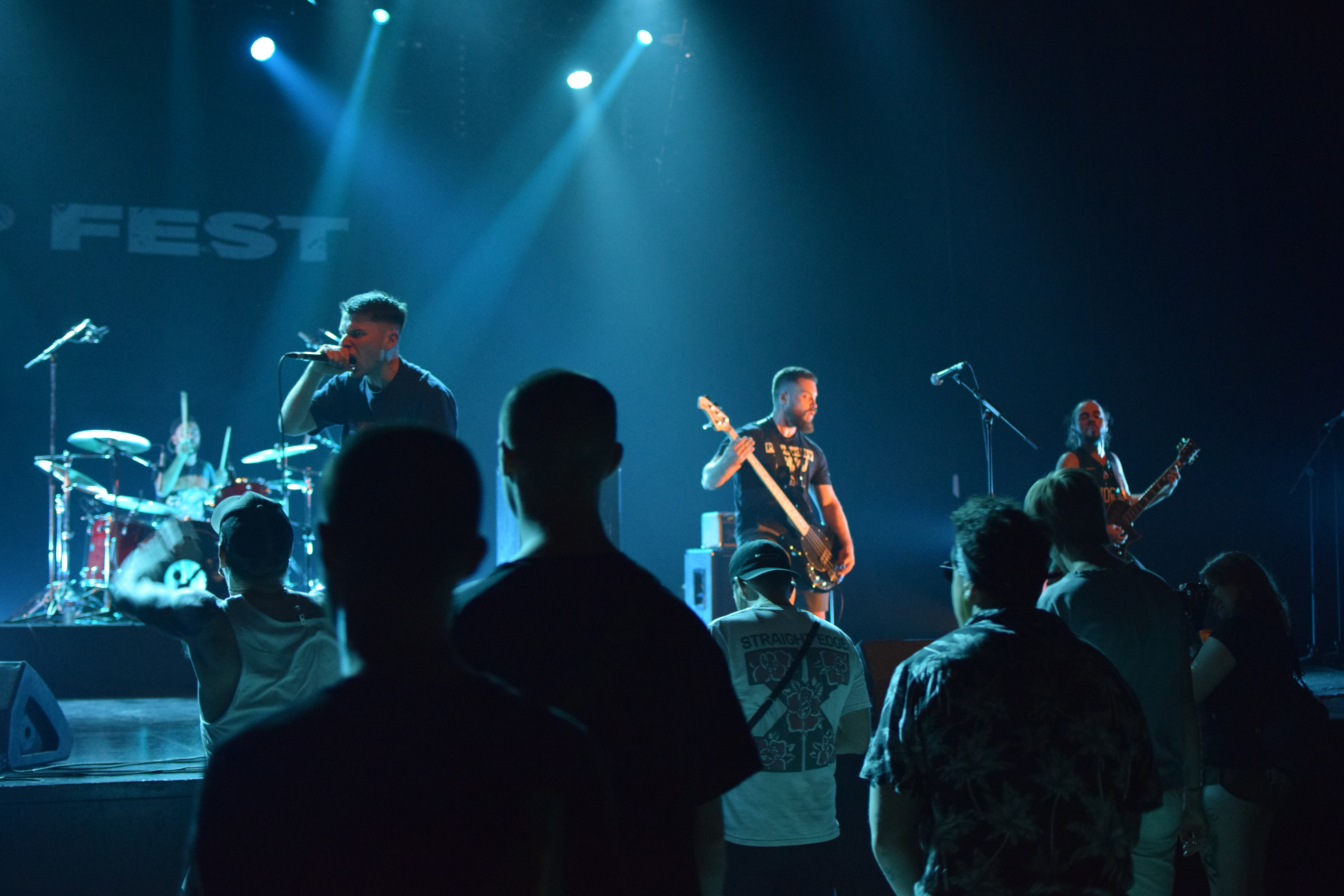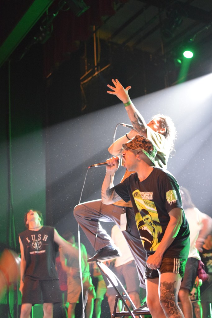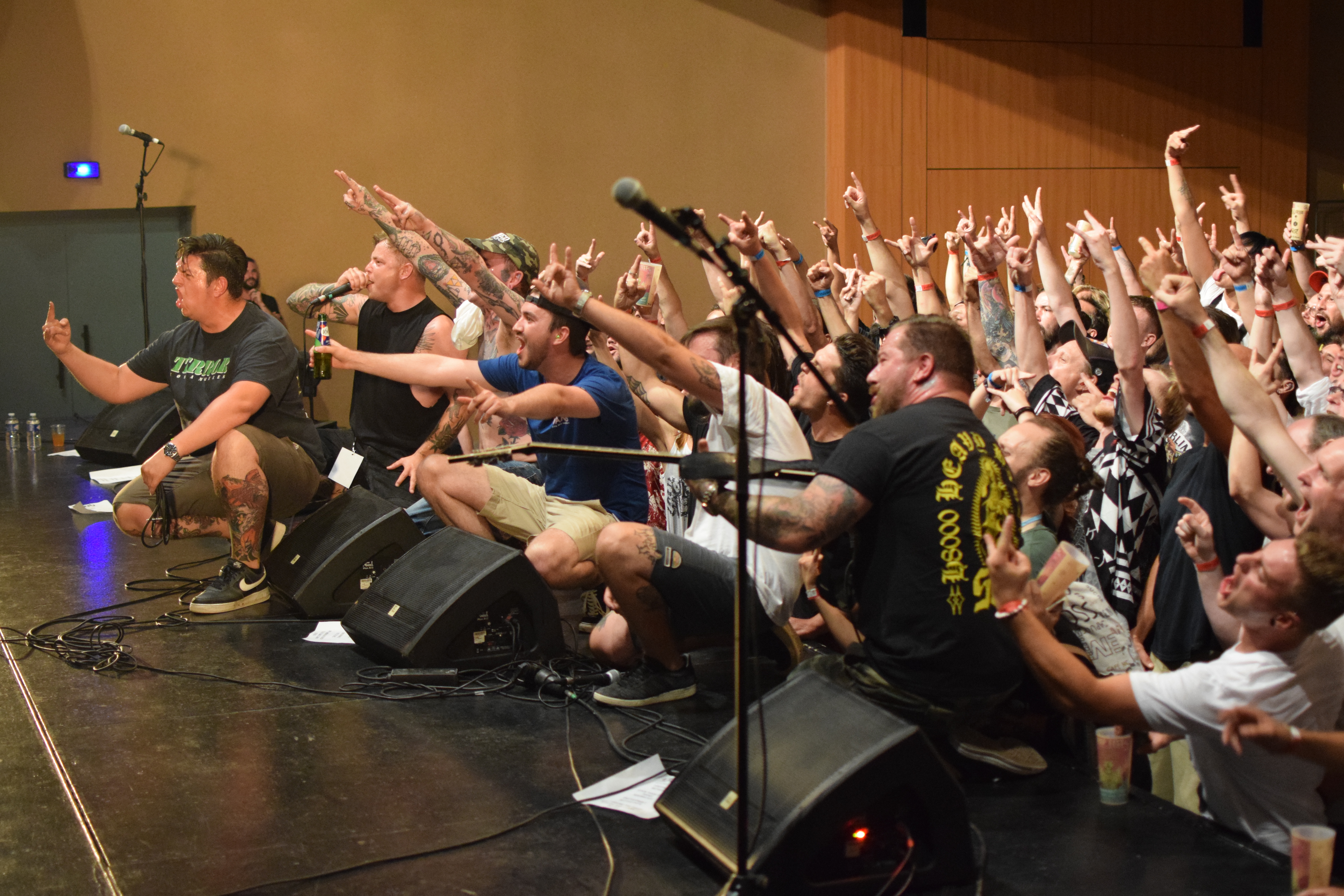 L’ambiance monte clairement d’un cran avec l’arrivée de Stab (trad : coup de couteau), qui a remplacé le groupe Lifesick initialement prévu. Les circle-pit vont bon train et nous rafraîchissent presque l’air, aussi efficace qu’un ventilo. Belle complicité sur scène où les frontman s’essuient mutuellement le visage qui coule à grosse gouttes, il faut dire qu’ils se donnent. A plusieurs reprises ils interpellent le public, un véritable échange se crée et le set reste un des meilleurs moment de cette 1re journée. Le groupe, ravie d’être de retour en France depuis un petit temps, sera le seul du fest à demander une photo de famille à la fin de leur prestation, histoire de garder un souvenir en plus des oreilles bourdonnantes.
