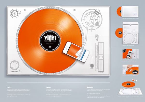 Le label de musique électro, Kontor Records et l’agence de pub Ogilvy ont mis au point le projet « Back To Vinyl, The Office Turntable »: un vinyle (de l’artiste DJ Trance) qui se lit via une application et dont la pochette sert de platine. Vous ne comprenez rien ? Regardez la vidéo :